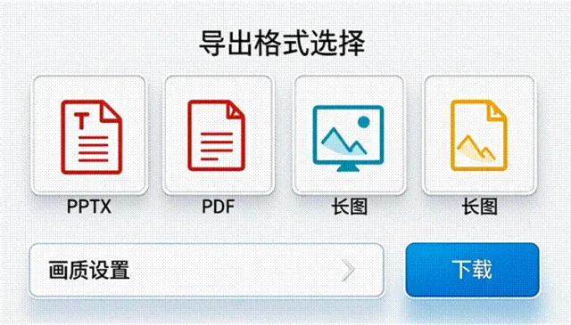完成编辑后,可以选择多种格式导出。PPTX格式可编辑,适合需要进一步修改的场景;PDF格式适合打印分发或发送给他人查看;长图格式适合在微信等社交平台分享。免费版生成的PPT无水印,可放心用于工作汇报、学术答辩等正式场景。
