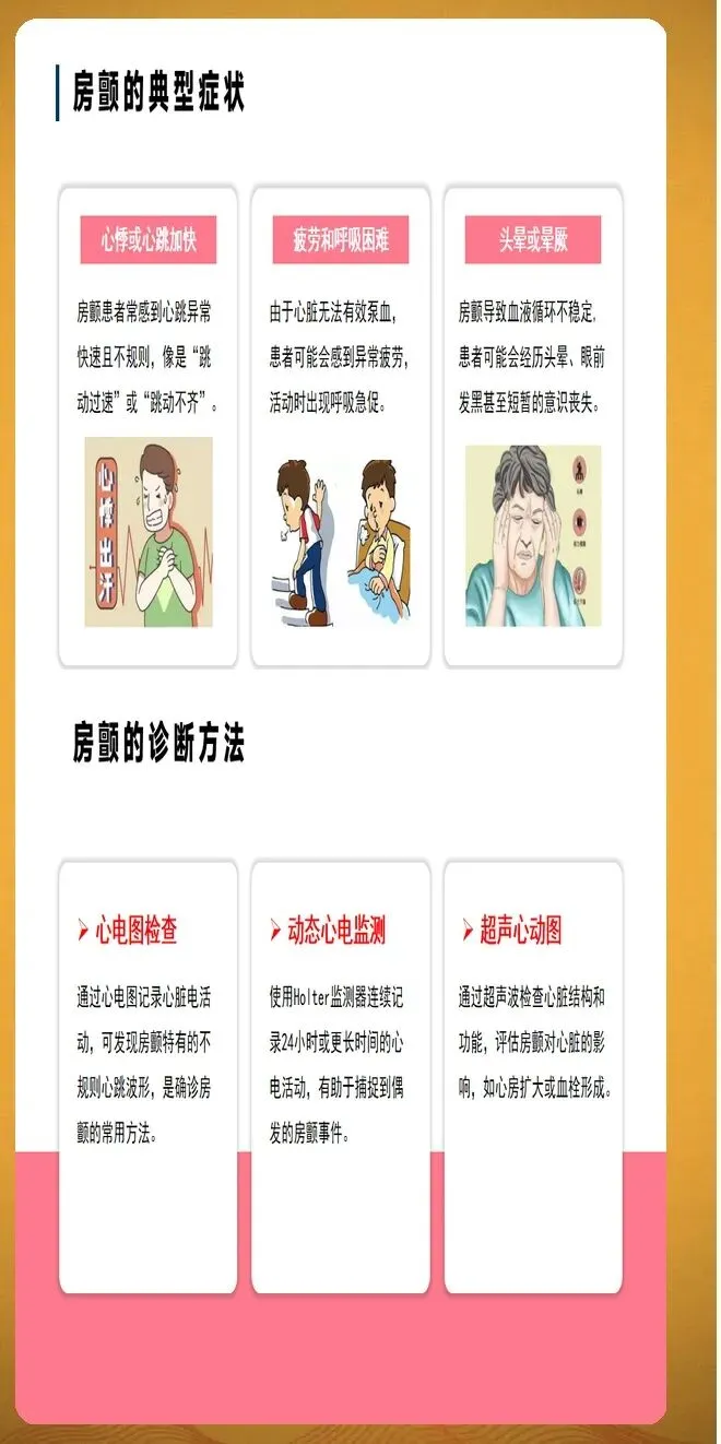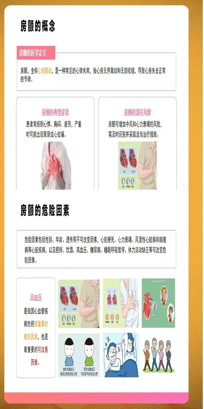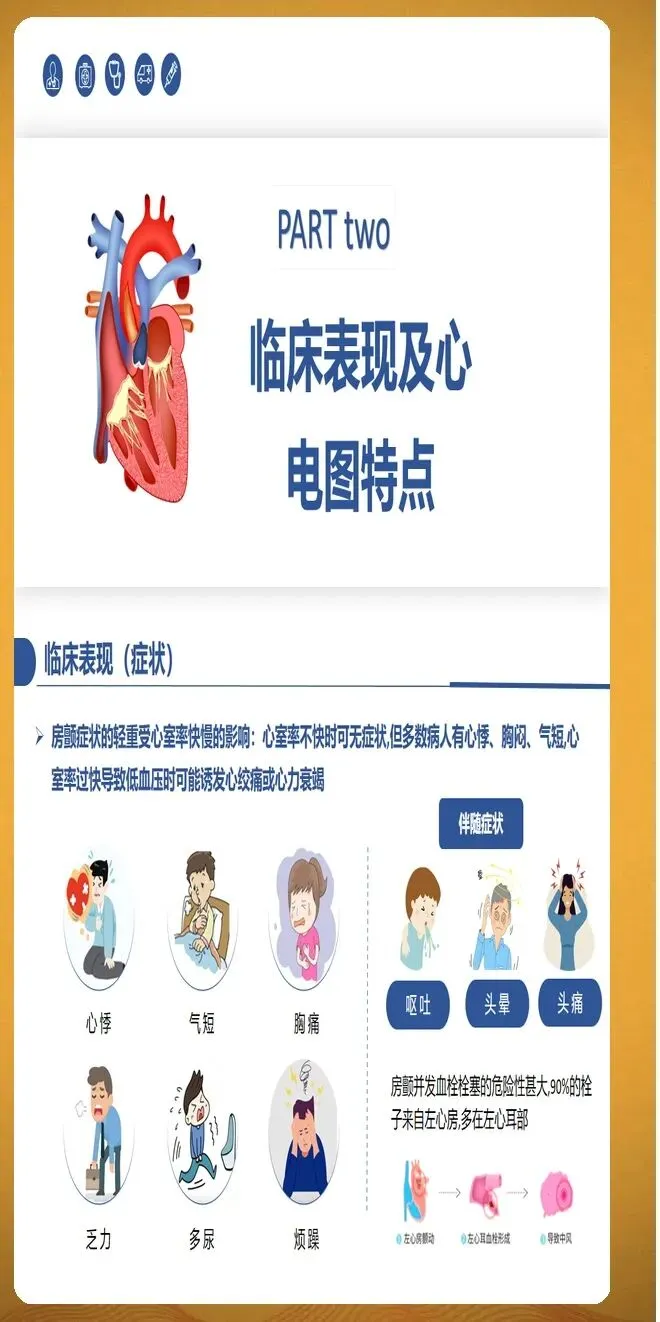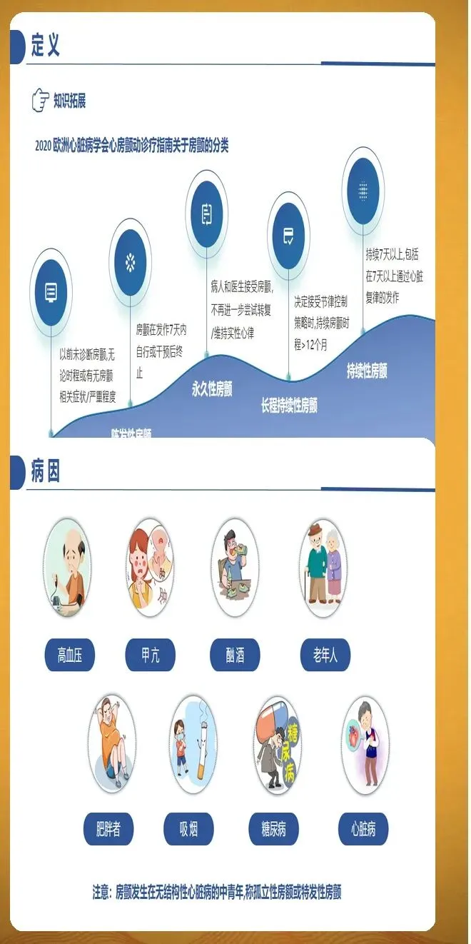 房颤分类按照病程时长进行划分。阵发性房颤指发作在7天内自行终止,多数在48小时内恢复。持续性房颤指持续时间超过7天,需要医疗干预才能转复。长程持续性房颤指连续发作至少12个月,患者和医生仍然选择节律控制策略。永久性房颤指患者和医生共同决定不再尝试恢复窦性心律。此外,随着智能穿戴设备的普及,设备检测的亚临床房颤越来越常见,这类房颤通常没有明显症状,但同样会增加血栓栓塞风险。
