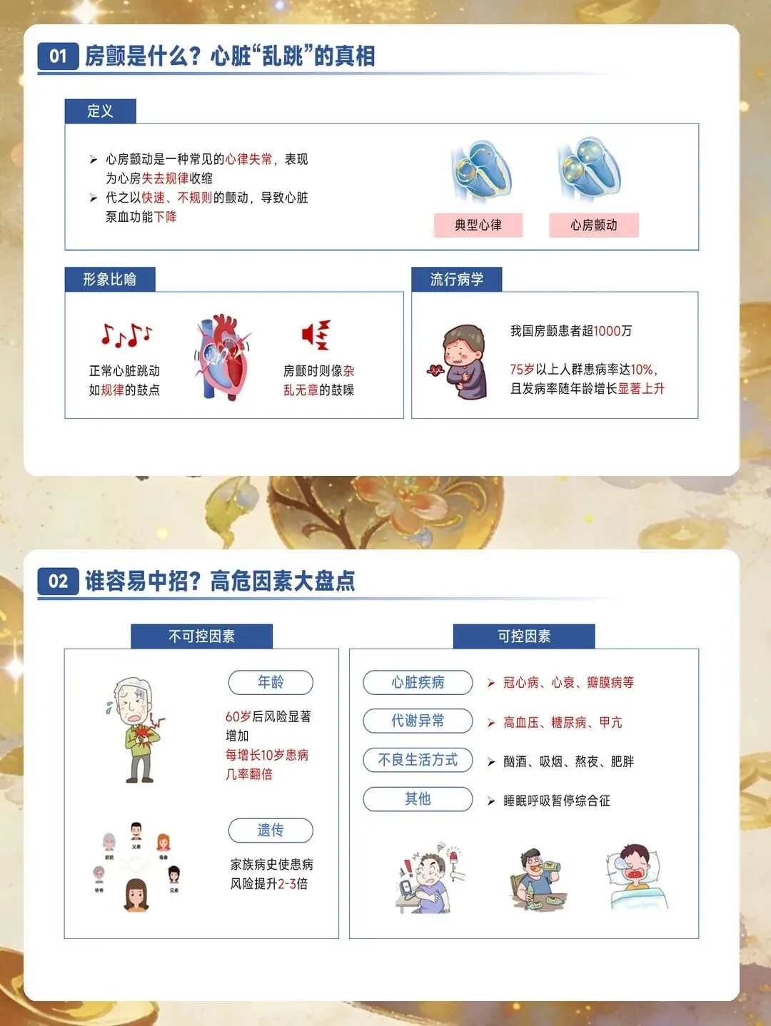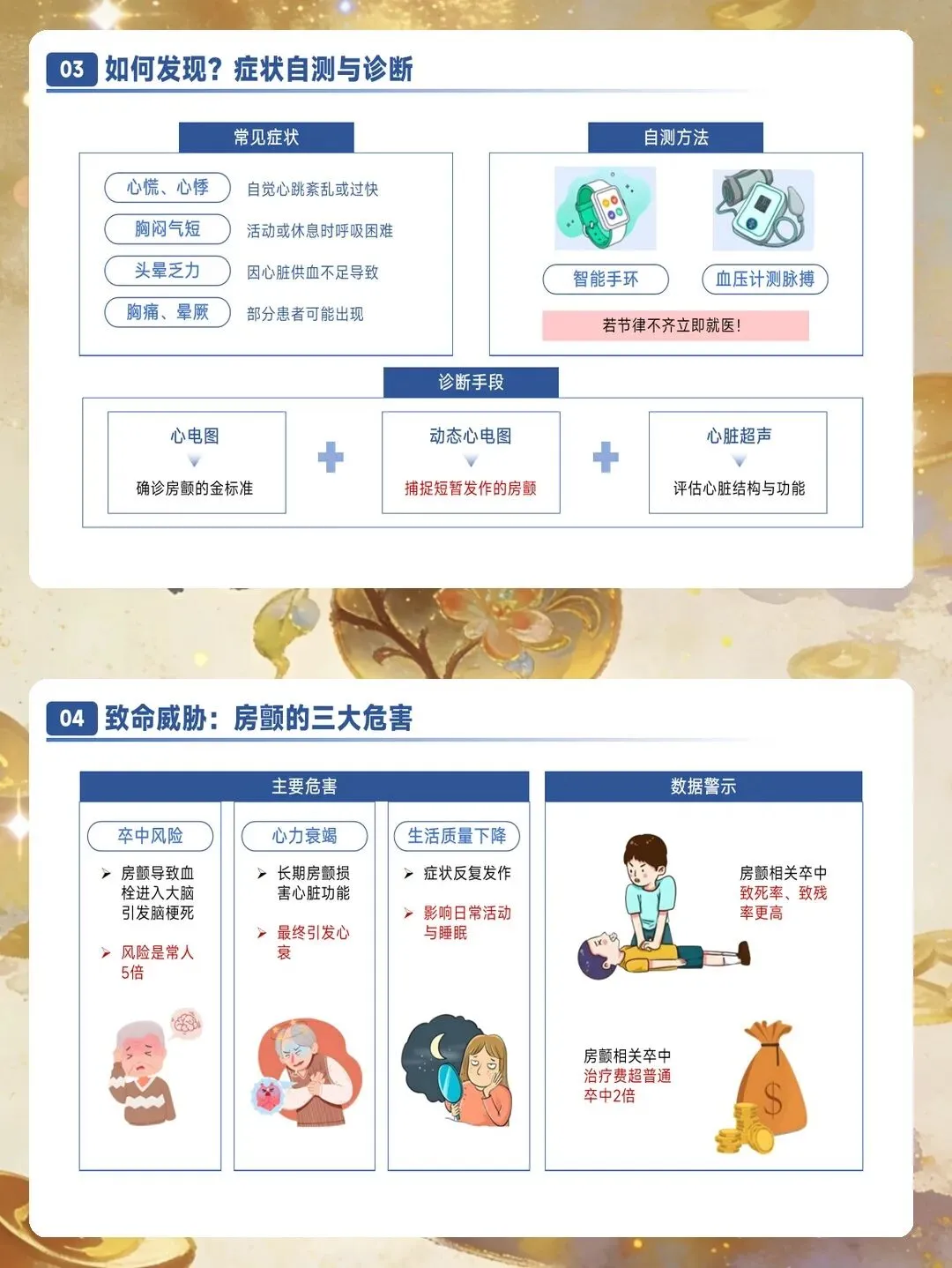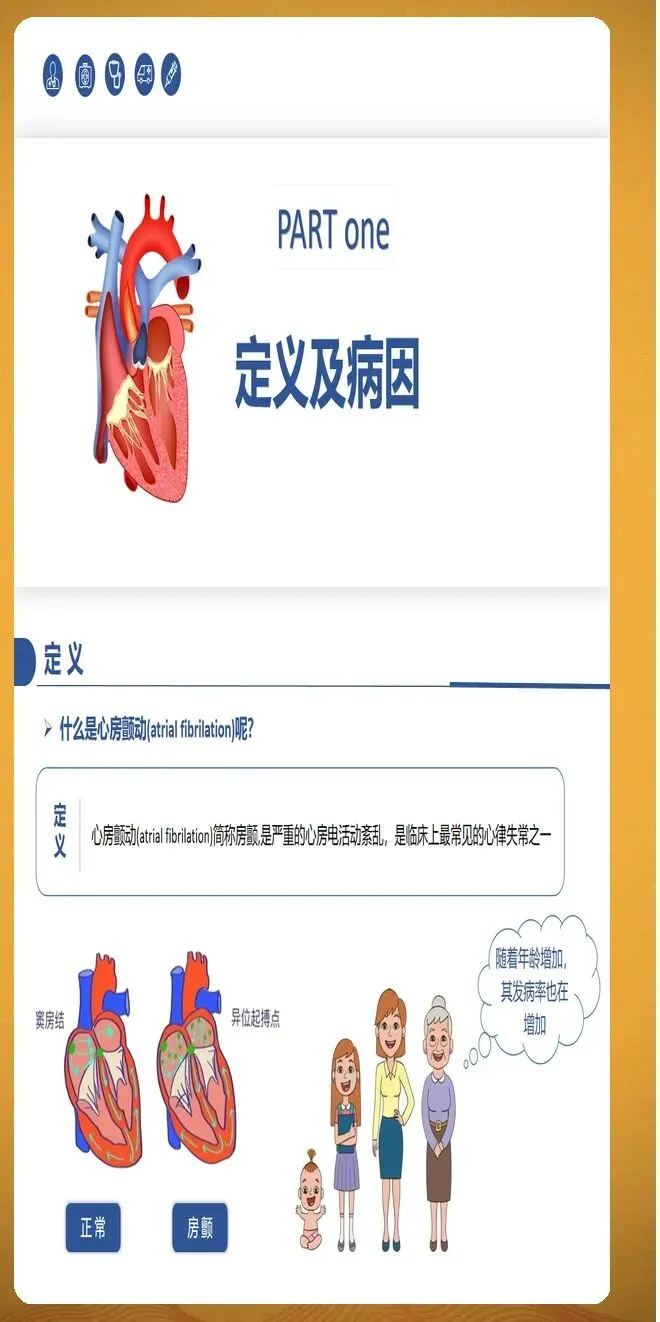 房颤分类按照病程时长进行划分。阵发性房颤指发作在7天内自行终止,多数在48小时内恢复。持续性房颤指持续时间超过7天,需要医疗干预才能转复。长程持续性房颤指连续发作至少12个月,患者和医生仍然选择节律控制策略。永久性房颤指患者和医生共同决定不再尝试恢复窦性心律。此外,随着智能穿戴设备的普及,设备检测的亚临床房颤越来越常见,这类房颤通常没有明显症状,但同样会增加血栓栓塞风险。