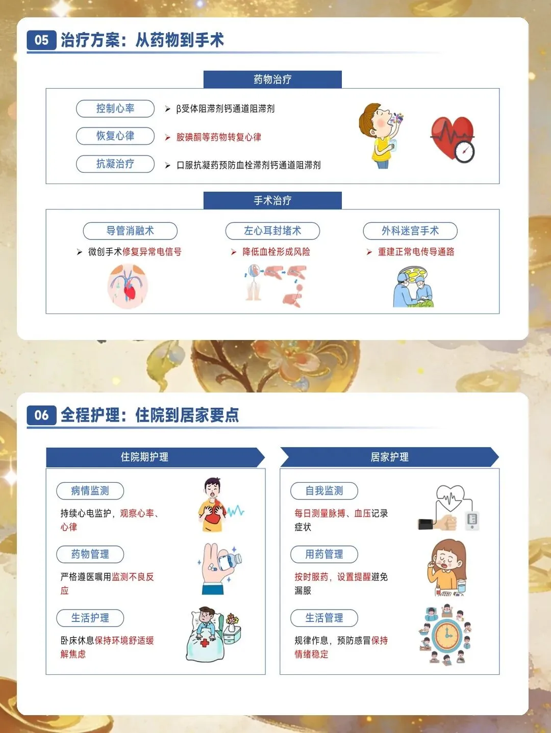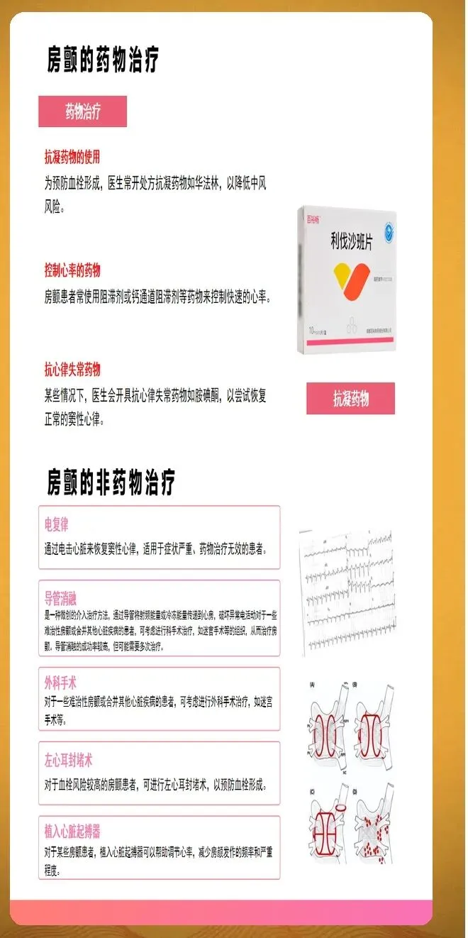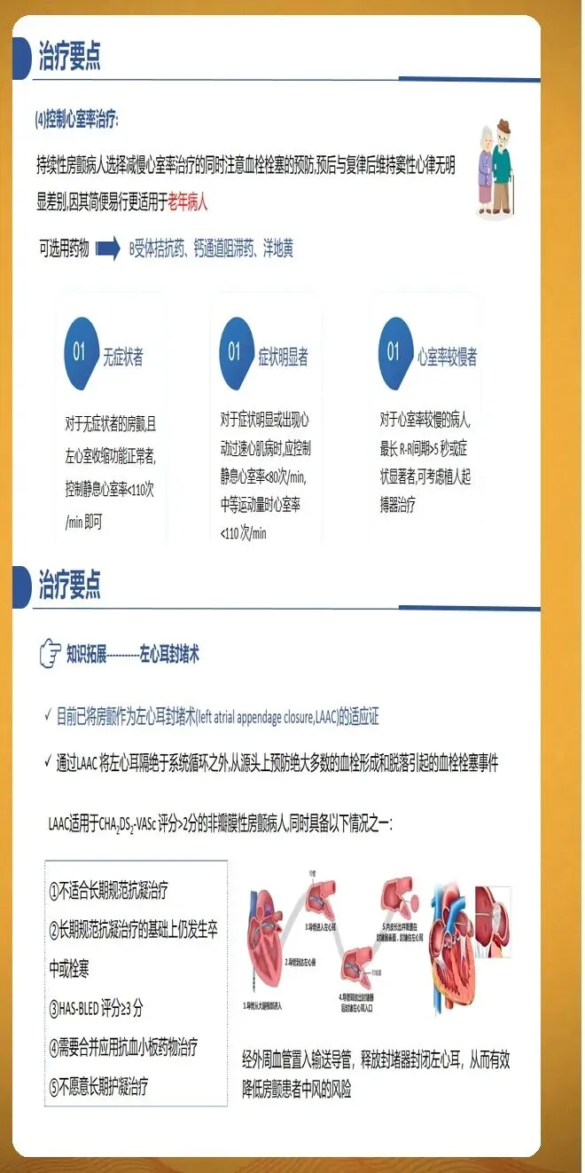 心室率控制适用于不能或不愿意接受节律控制的患者。控制目标分为宽松和严格两种策略。宽松控制指静息心率小于每分钟110次,适用于症状不明显的患者。严格控制指静息心率小于每分钟80次,适用于症状明显或合并心动过速性心肌病的患者。首选药物为β受体阻滞剂,如美托洛尔、比索洛尔等。非二氢吡啶类钙通道阻滞剂如地尔硫卓、维拉帕米也可用于左心室收缩功能正常的患者。洋地黄类药物如地高辛可与其他药物联合使用,特别适用于合并心力衰竭的患者。