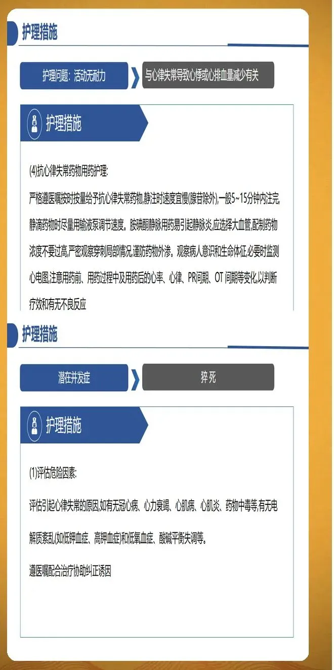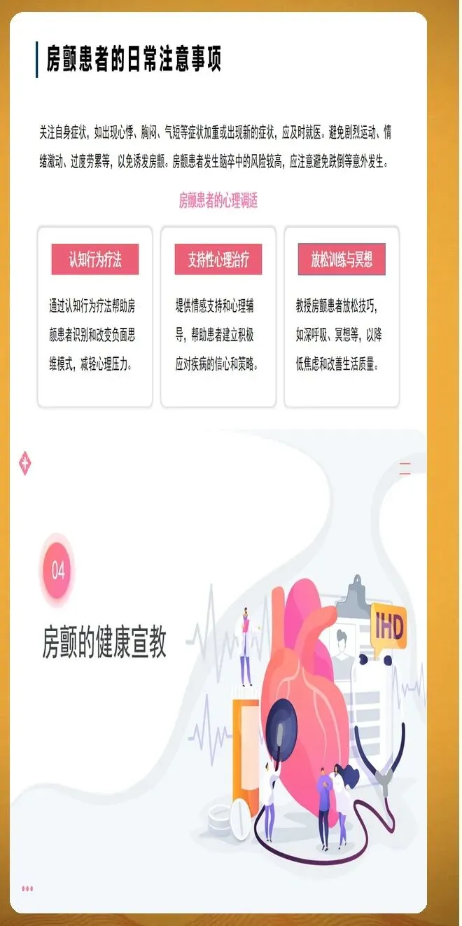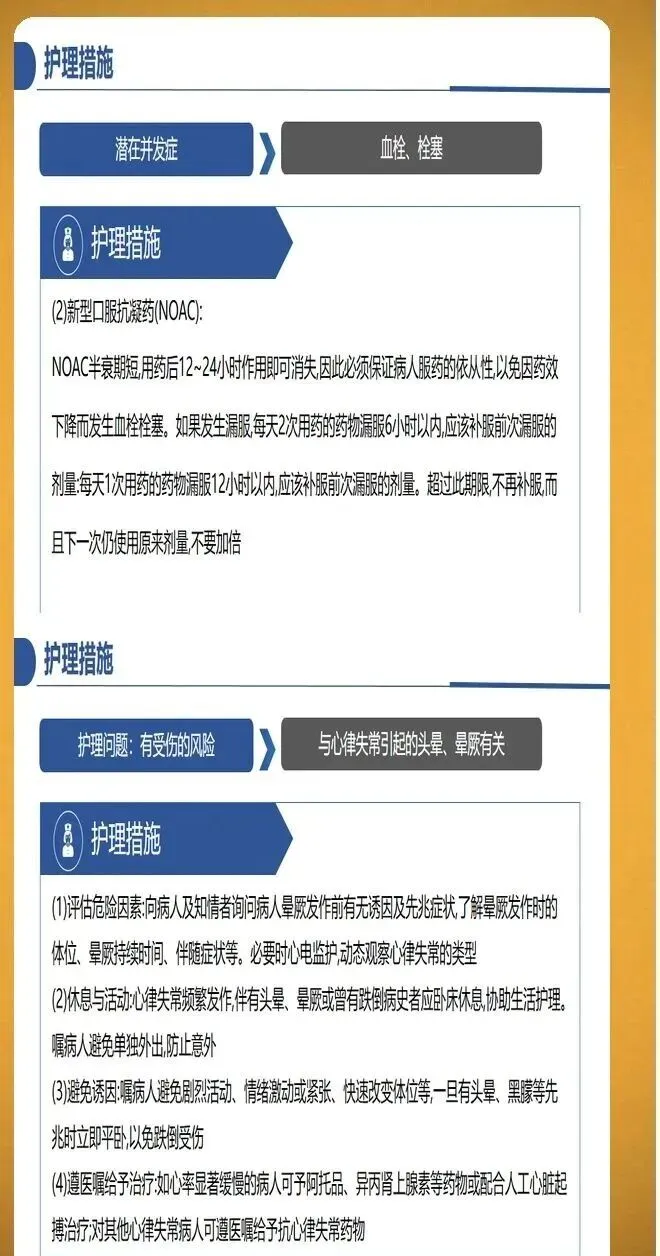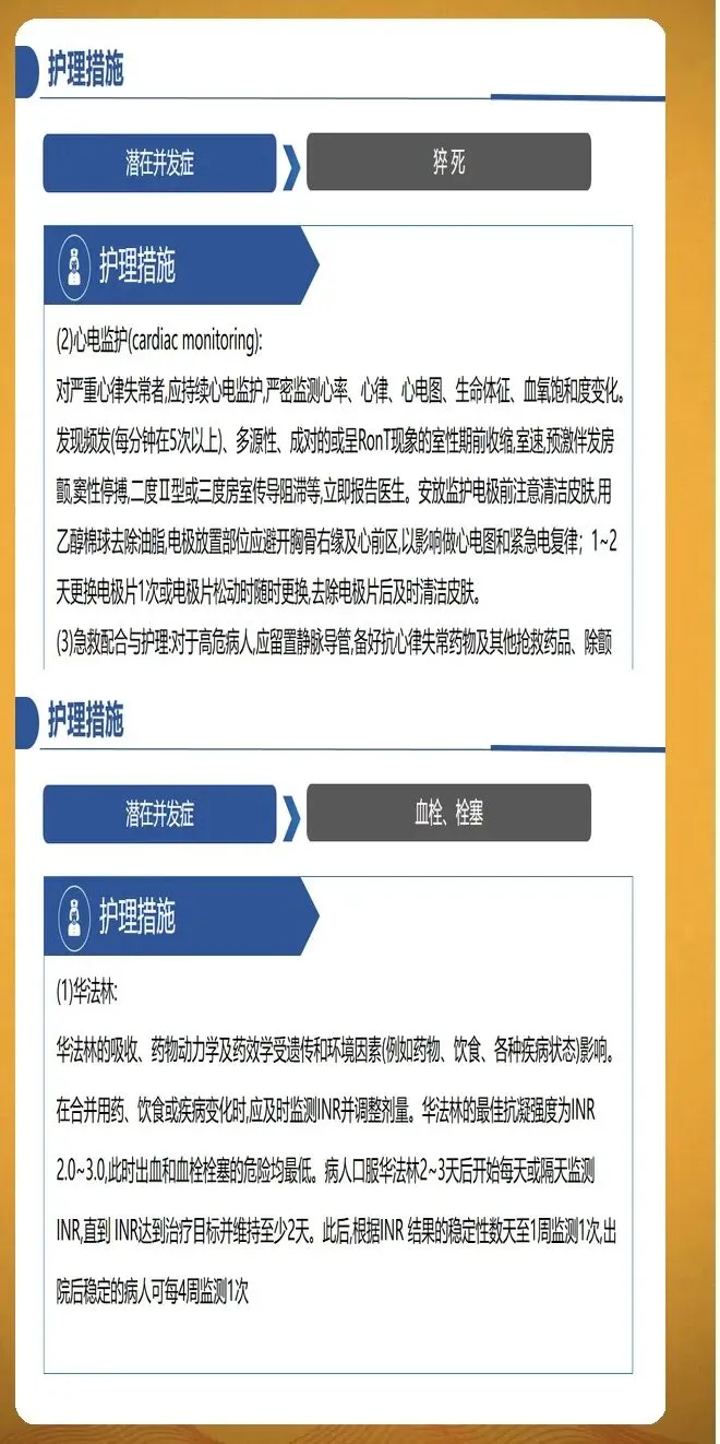 并发症预防护理需要全面覆盖血栓栓塞、心力衰竭和其他严重并发症。血栓栓塞预防的核心是规范抗凝治疗,同时识别卒中征兆并立即就医,包括面部歪斜、一侧手臂无力下垂、口齿不清等症状。心力衰竭预防需要密切观察容量负荷变化,每日记录体重,24小时内增幅大于等于2公斤需要警惕。观察颈静脉怒张、下肢水肿程度,听诊肺部湿啰音是否增多。监测脑钠肽水平动态变化,较基线上升30%提示风险增加。其他并发症包括心绞痛、猝死、肾功能损伤等,需要针对性预防措施。