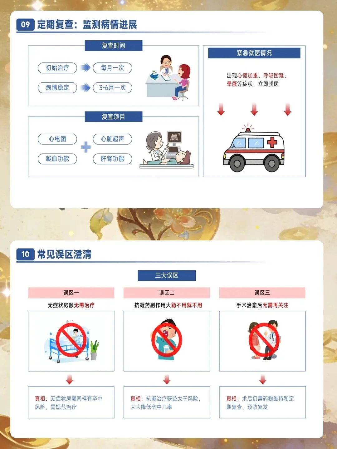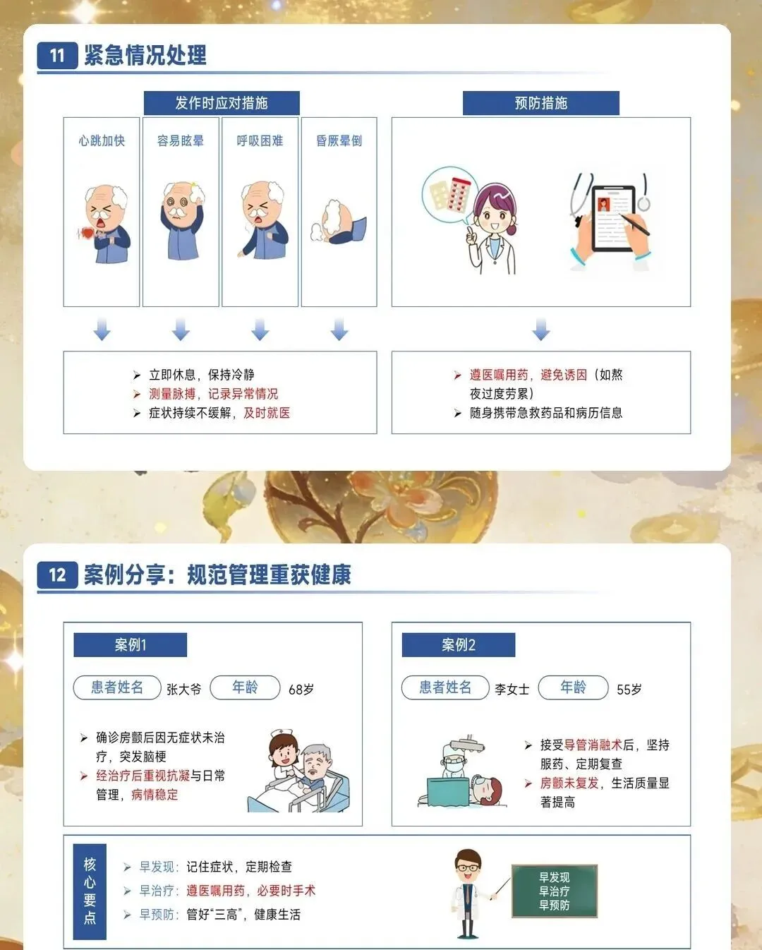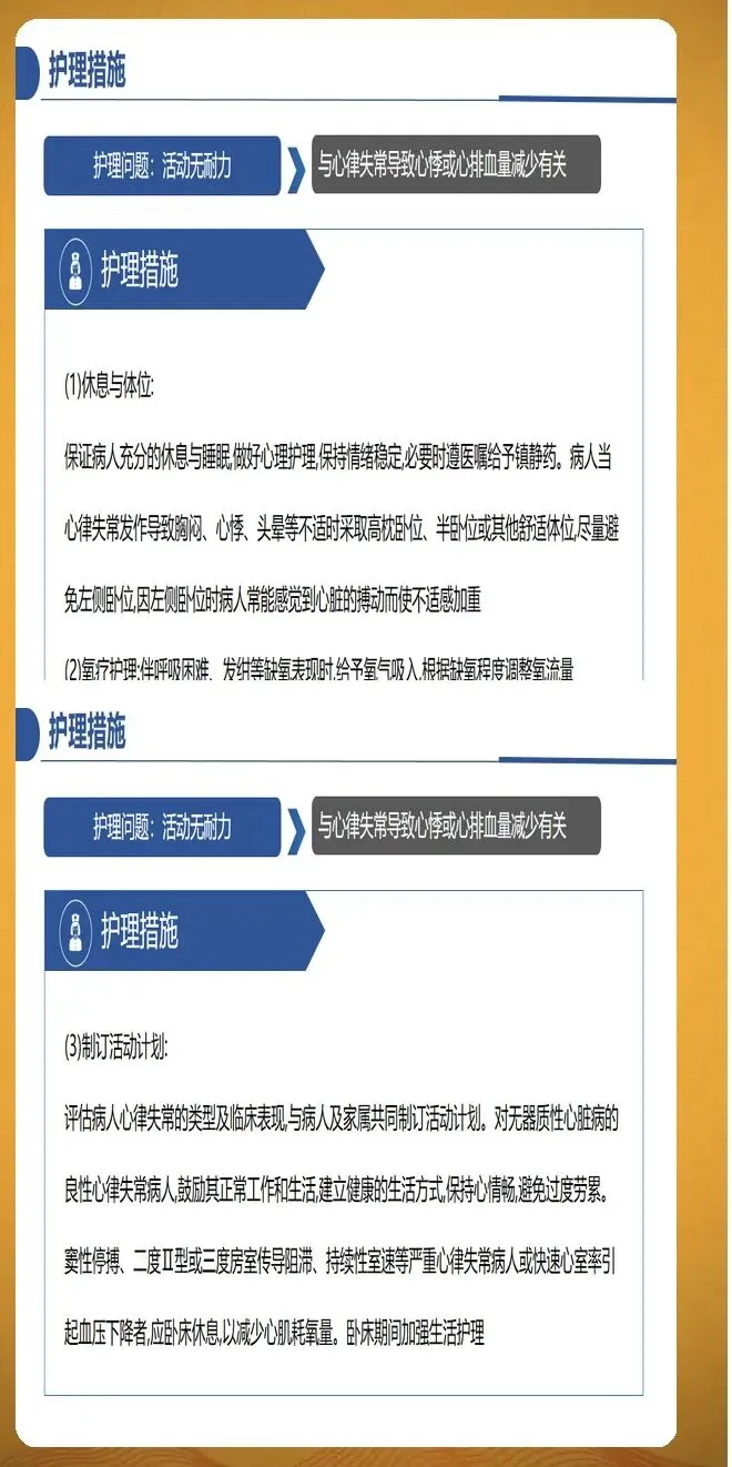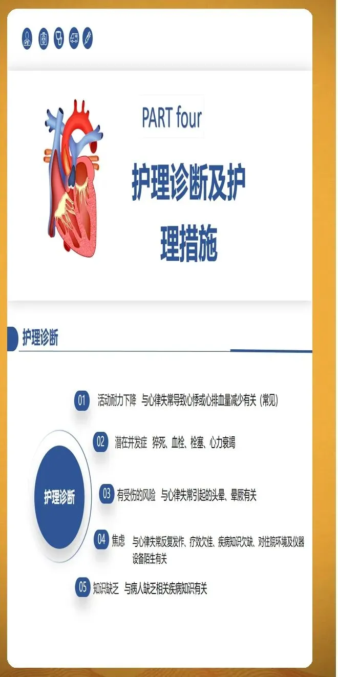 并发症预防护理需要全面覆盖血栓栓塞、心力衰竭和其他严重并发症。血栓栓塞预防的核心是规范抗凝治疗,同时识别卒中征兆并立即就医,包括面部歪斜、一侧手臂无力下垂、口齿不清等症状。心力衰竭预防需要密切观察容量负荷变化,每日记录体重,24小时内增幅大于等于2公斤需要警惕。观察颈静脉怒张、下肢水肿程度,听诊肺部湿啰音是否增多。监测脑钠肽水平动态变化,较基线上升30%提示风险增加。其他并发症包括心绞痛、猝死、肾功能损伤等,需要针对性预防措施。