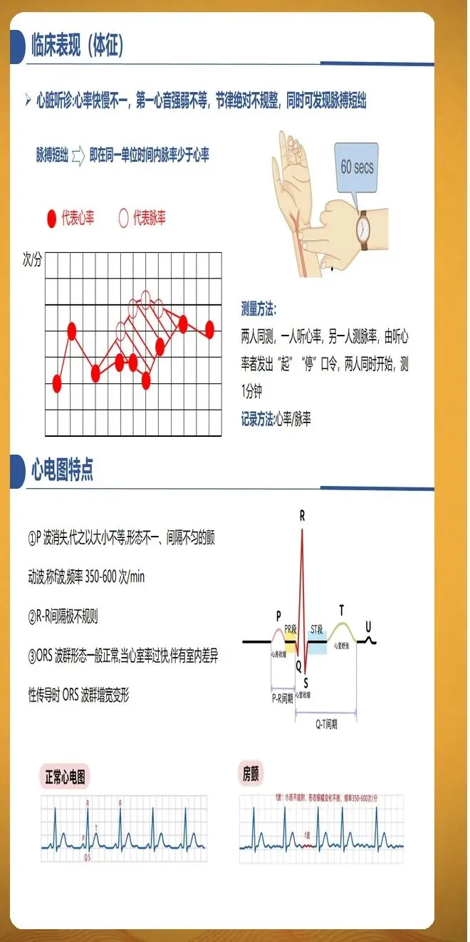 房颤患者的护理评估包括全面采集病史和体格检查。病史采集应重点关注症状类型、发作频率和持续时间、诱发因素、既往治疗反应等。症状评估采用欧洲心律学会分级系统,1级为无症状,2a级为轻度症状,2b级为中度症状,3级为重度症状,4级为致残症状。体格检查重点观察脉搏短绌现象、第一心音强弱不等、心脏杂音、水肿等体征。辅助检查包括12导联心电图确诊、动态心电图评估负荷和心室率、超声心动图评估心脏结构和功能、实验室检查评估肝肾功能、甲状腺功能和脑钠肽水平。