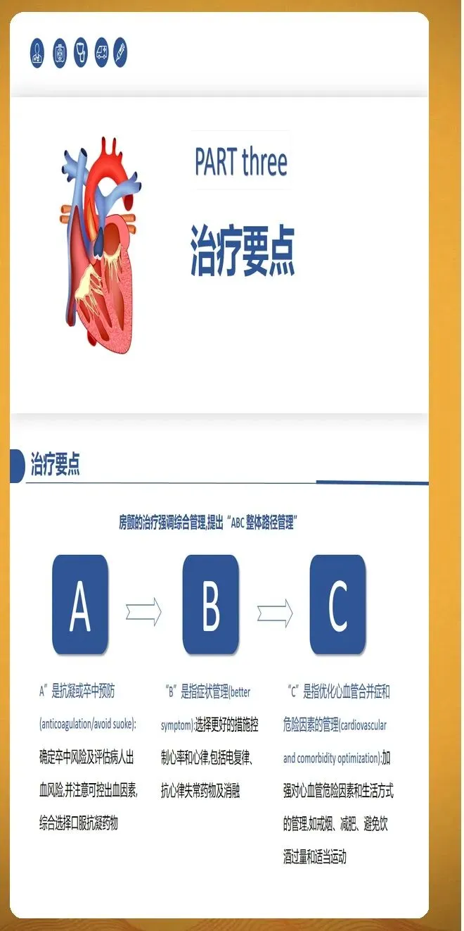 抗凝治疗是房颤管理的核心环节。风险评估采用CHA2DS2评分系统,该评分包括心力衰竭、高血压、年龄75岁及以上、糖尿病、卒中或短暂性脑缺血发作史、血管病变、年龄65至74岁、女性性别等风险因素。评分大于等于2分的患者应接受长期抗凝治疗,评分为1分的患者可考虑抗凝治疗,评分为0分的患者无需抗凝治疗。出血风险评估采用HASBLED评分,但评分高不是拒绝抗凝治疗的理由,应先纠正可逆的出血因素,如控制血压、停用不必要的阿司匹林、治疗胃溃疡等。