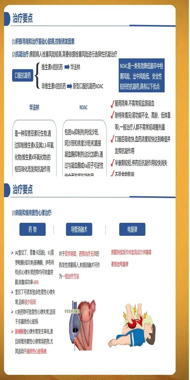 节律控制策略包括电复律、药物复律和导管消融。电复律适用于血流动力学不稳定或症状明显的患者,复律前需要抗凝治疗至少3周或通过经食管超声排除心房血栓,复律后需要继续抗凝至少4周。药物复律适用于无器质性心脏病的阵发性房颤患者,常用药物包括普罗帕酮、氟卡尼、胺碘酮等。导管消融在症状性房颤患者中的地位显著提升,对于阵发性房颤患者已推荐作为一线治疗,对于持续性房颤患者也可考虑早期干预。导管消融的技术发展包括三维标测系统、压力感应导管、冷冻球囊消融和脉冲电场消融等新技术。