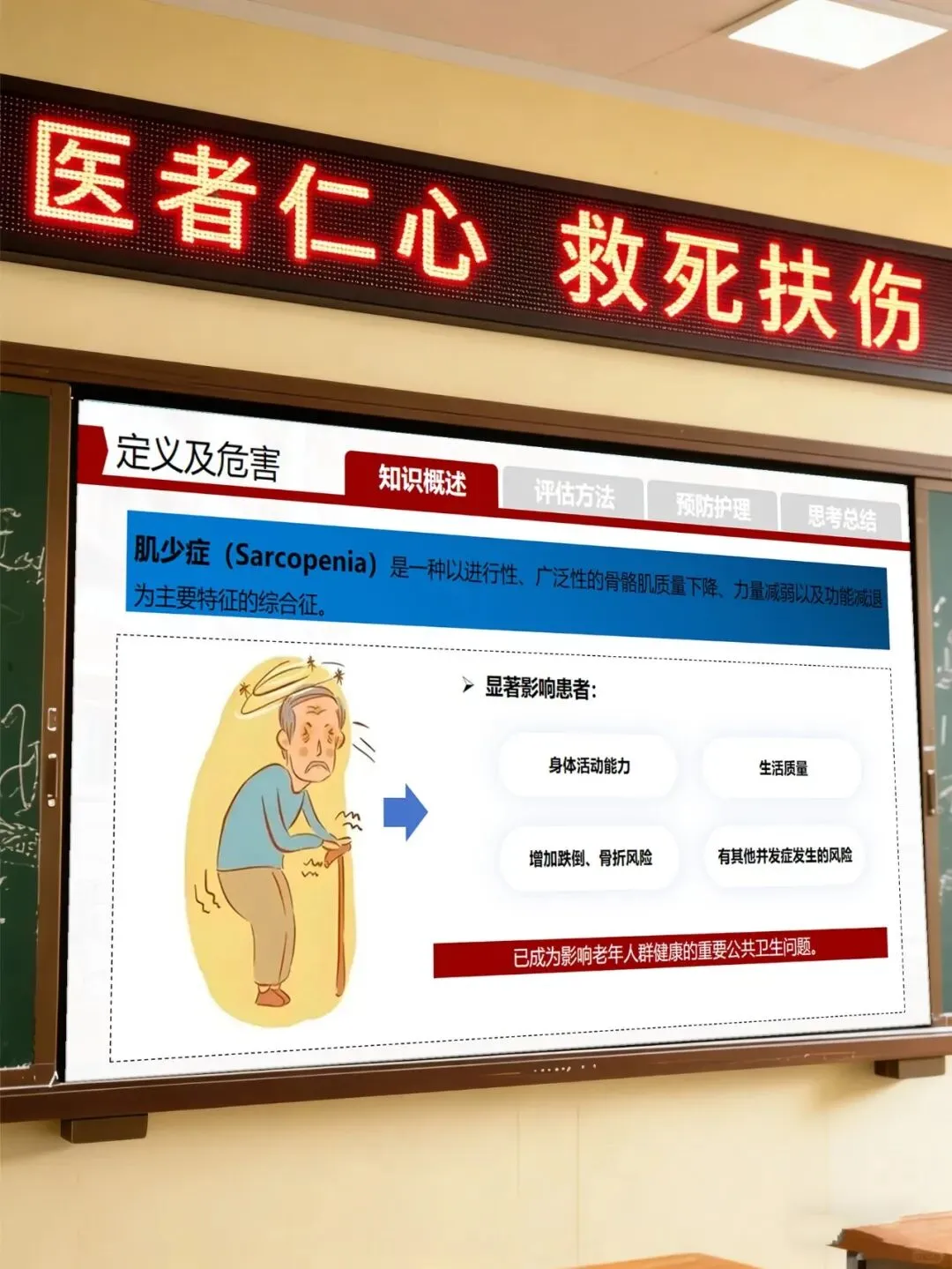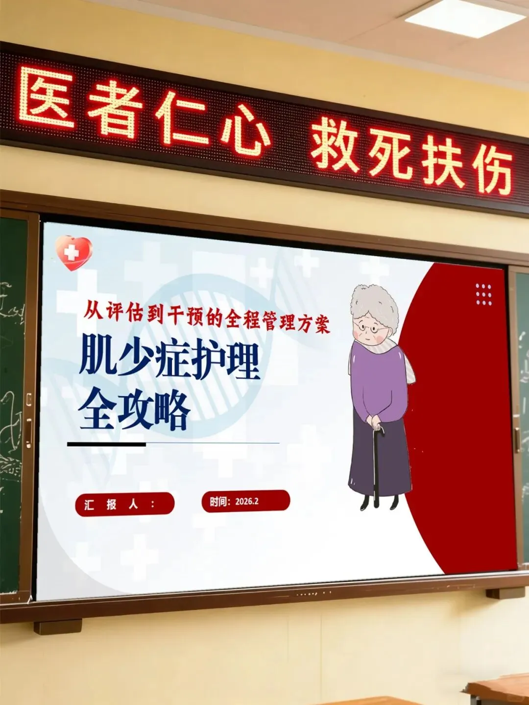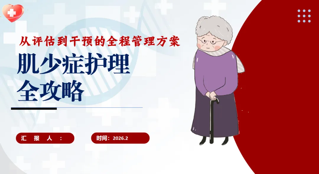 各位同事,今天咱们聚焦肌少症护理开展授课,核心是把肌少症从评估到干预的全程护理实操要点捋透彻,把临床照护的关键方法讲明白,让咱们能精准识别、科学干预,用专业护理帮患者守住肌肉健康,尤其是老年群体,降低跌倒、并发症风险,让他们的晚年生活更有质量。