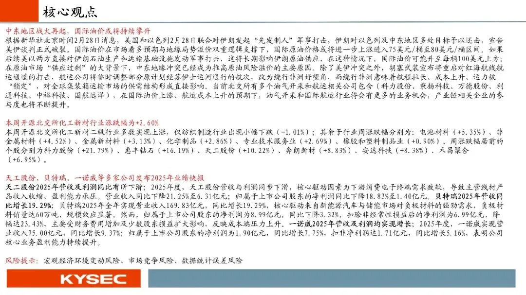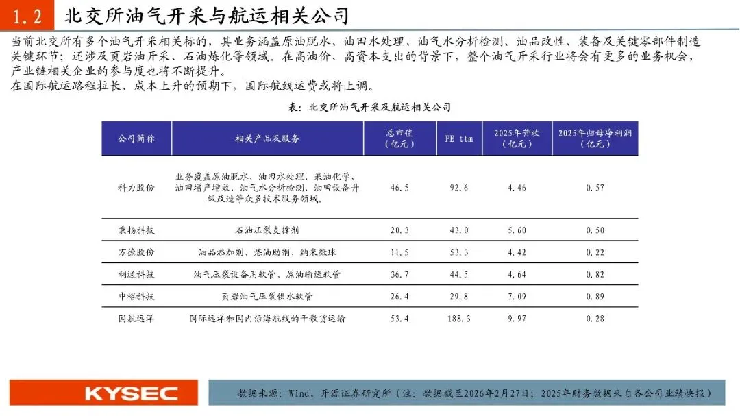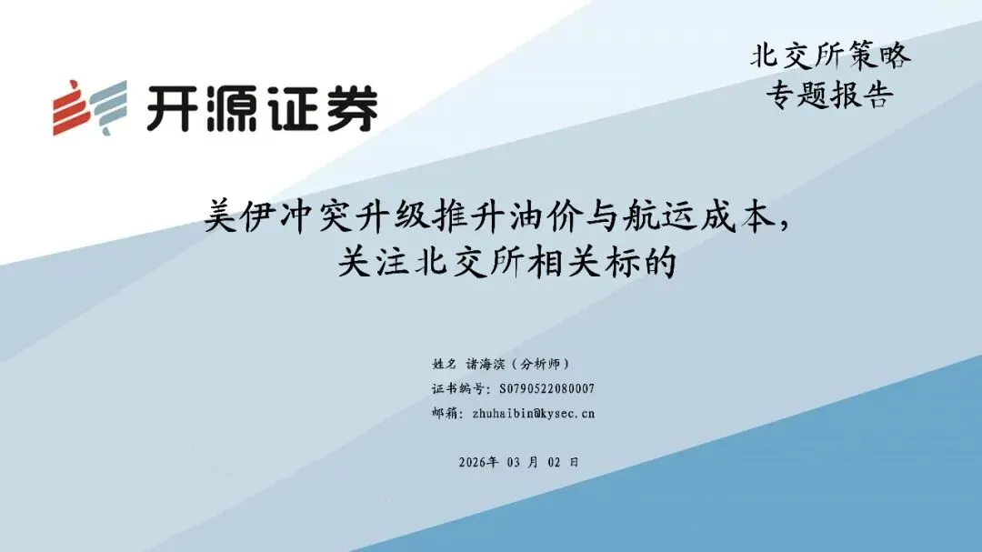 根据新华社北京时间2月28日消息,美国和以色列2月28日联合对伊朗发起“先发制人”军事打击,伊朗对以色列及中东地区多处目标予以还击,宣告美伊谈判正式破裂。国际油价在市场看多预期与地缘局势溢价双重逻辑支撑下,国际原油价格或将进一步上涨进入75美元/桶至80美元/桶区间。如果后续美以两方直接对伊朗石油生产和运输基础设施发动军事打击,这将长期影响伊朗原油供应,在这种情况下,国际油价可能升至每桶100美元上方;在原油市场“供应过剩”的大背景下,中东地缘冲突已经成为推高原油风险溢价的主要原因。除了美伊冲突之外,胡塞武装宣布将重启对红海航线航运通道的打击,航运公司将临时调整部分原计划经苏伊士运河通行的航次,改为绕行非洲好望角,而绕行非洲意味着航程拉长、成本上升、运力被“锁定”,对全球集装箱运输市场的供需结构形成直接影响。当前北交所有多个油气开采和航运相关公司包含(科力股份、秉扬科技、万德股份、利通科技、中裕科技、国航远洋),在国际油价上涨、航运成本上升的预期下,油气开采和国际航运行业将会有更多的业务机会,产业链相关企业的参与度也将不断提升。