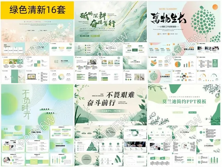 这16套绿色小清新通用PPT模板,以“绿色清新”为主题,融合了自然元素与简约设计风格,为演示文稿增添了生机与活力。