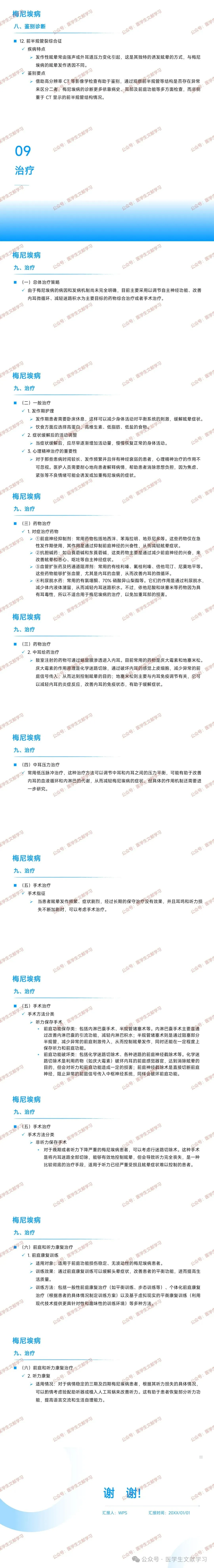总体治疗策略:病因和发病机制未完全明确,主要采用药物综合治疗或手术治疗,目标是调节自主神经功能、改善内耳微循环、减轻迷路积水。