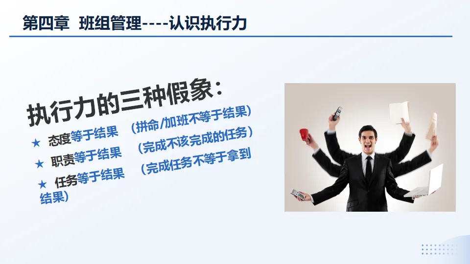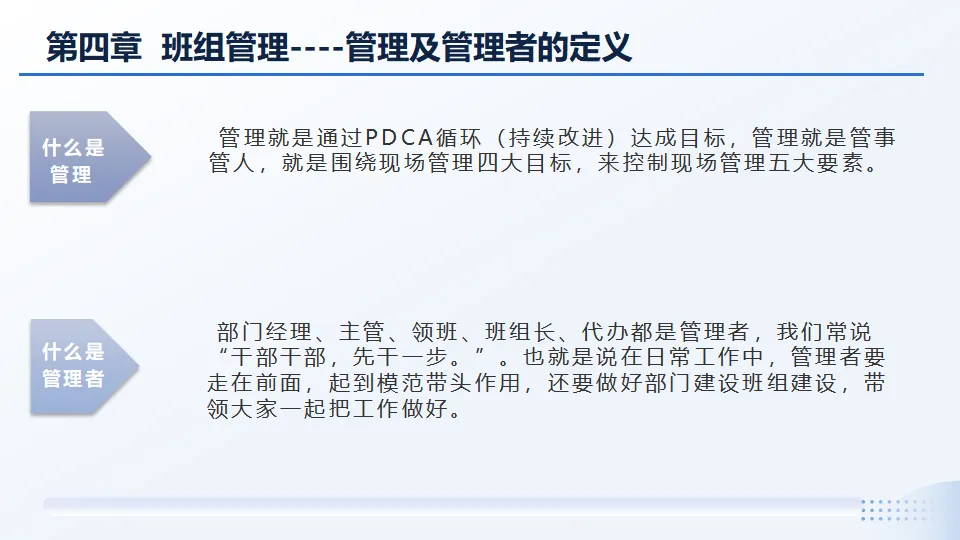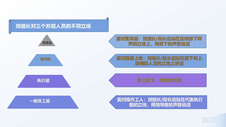 什么意思?就是说,虽然你和工人们很熟,可能还是朋友,但一旦进入工作状态,你就是上级的代表。你要传达的是公司的意志、标准的要求,而不是个人的意见。你要用领导者的权威和声音,确保指令被执行。