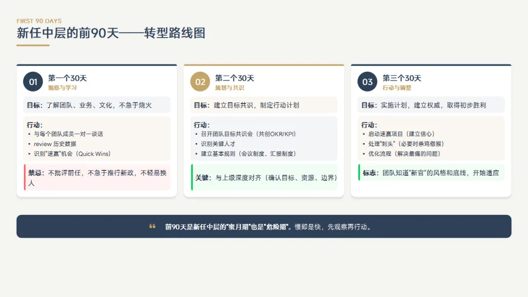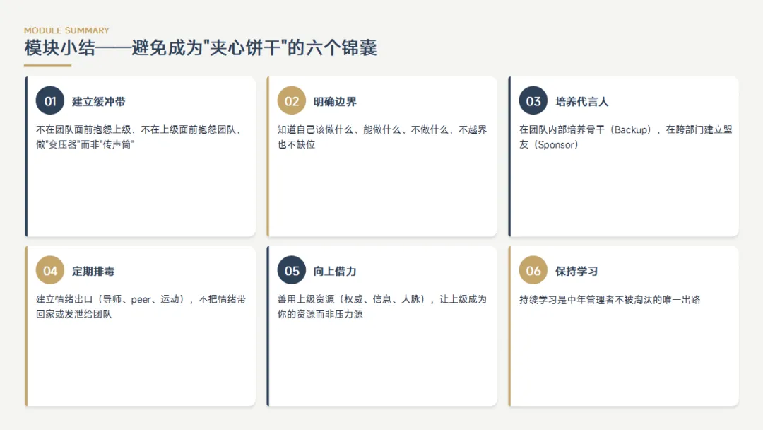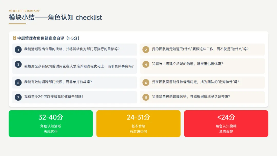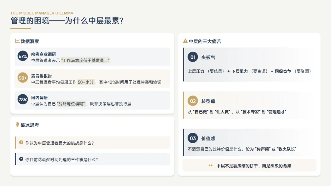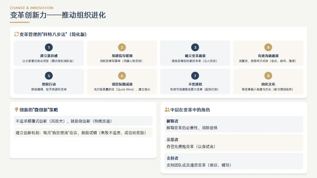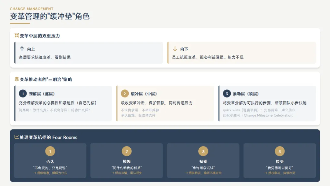 组织变革的中坚力量。变革往往从高层发起,但落地在中层。你们既要传递变革的必要性,又要缓冲变革对团队的冲击。