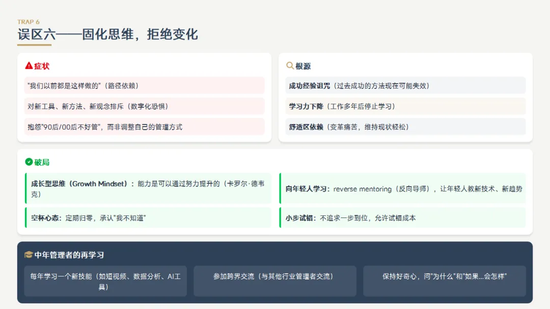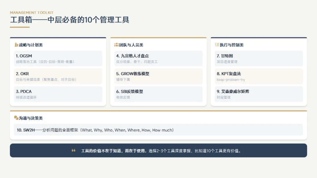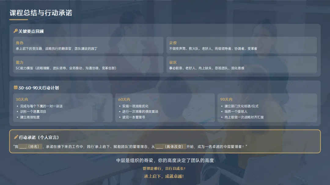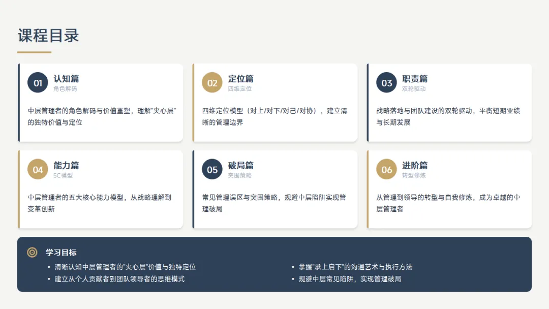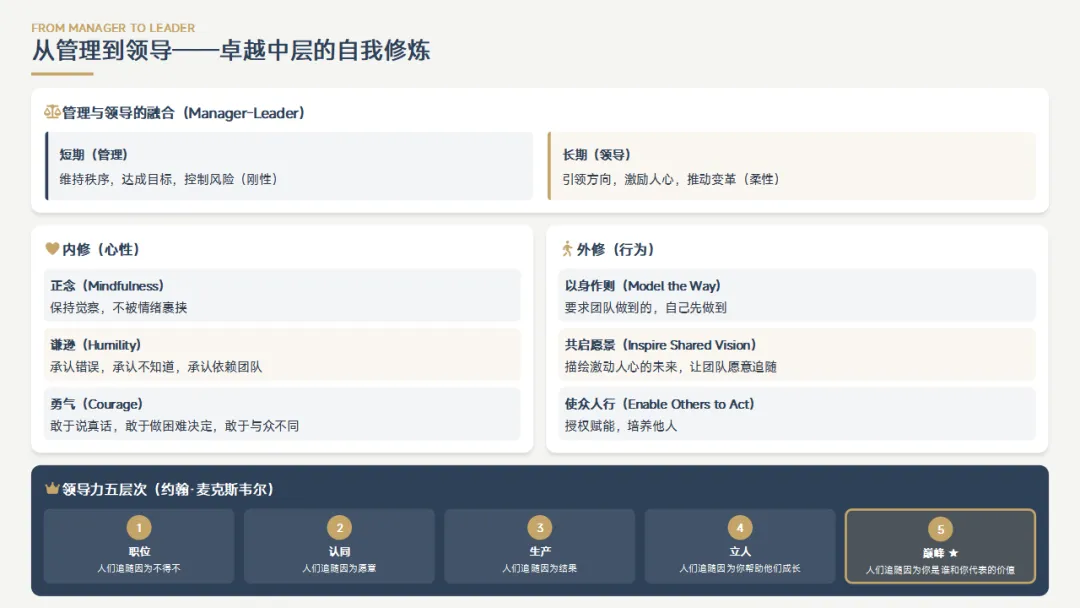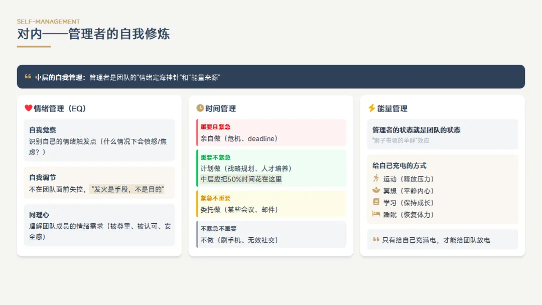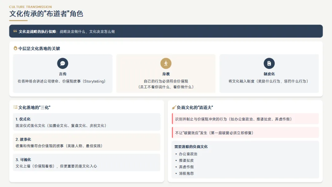 组织变革的中坚力量。变革往往从高层发起,但落地在中层。你们既要传递变革的必要性,又要缓冲变革对团队的冲击。