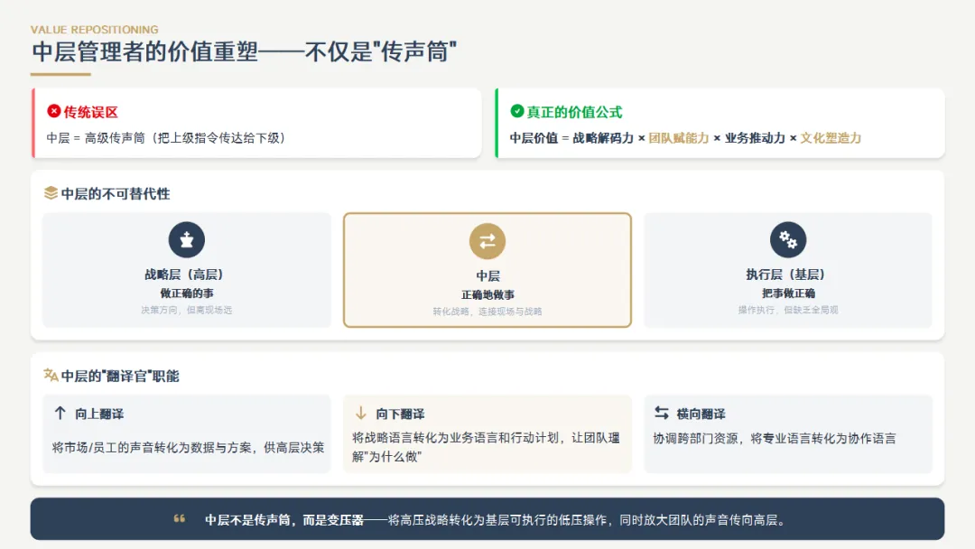 既然提到了"传声筒",我们就来解剖这个误区。在传统观念中,很多人认为中层就是"高级传声筒",把上级指令传达给下级就行了。如果是这样,那中层就没有存在的必要了,发一封邮件不是更高效吗?