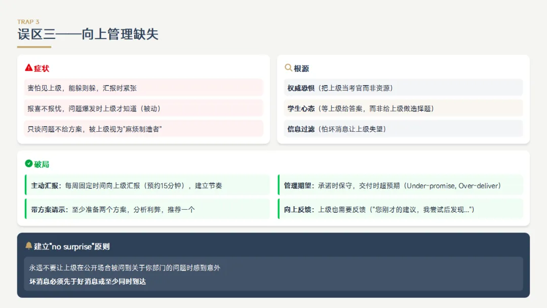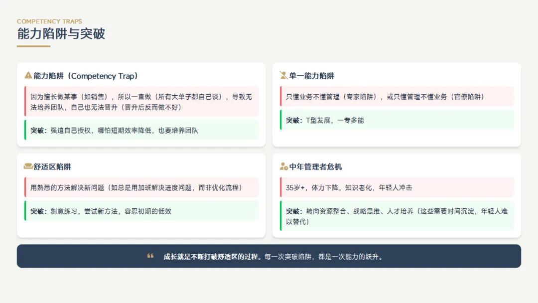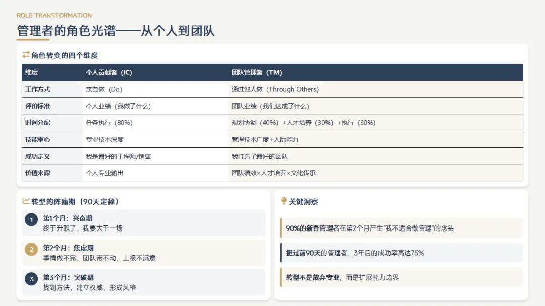 过去你靠专业技术深度吃饭,现在你需要管理技术广度加人际能力。转型不是放弃专业,而是扩展能力边界。