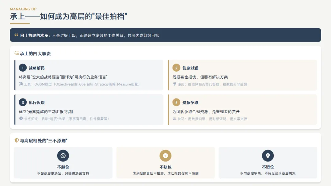 ——将高压的战略转化为基层可执行的低压操作,同时放大团队的声音传向高层。