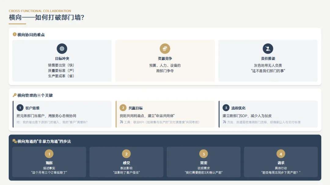 :你们要协调跨部门资源,将财务的专业语言、技术的专业语言、销售的专业语言,转化为大家都能理解的协作语言。