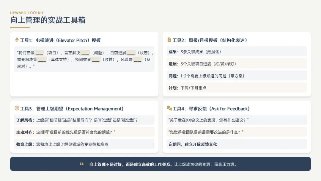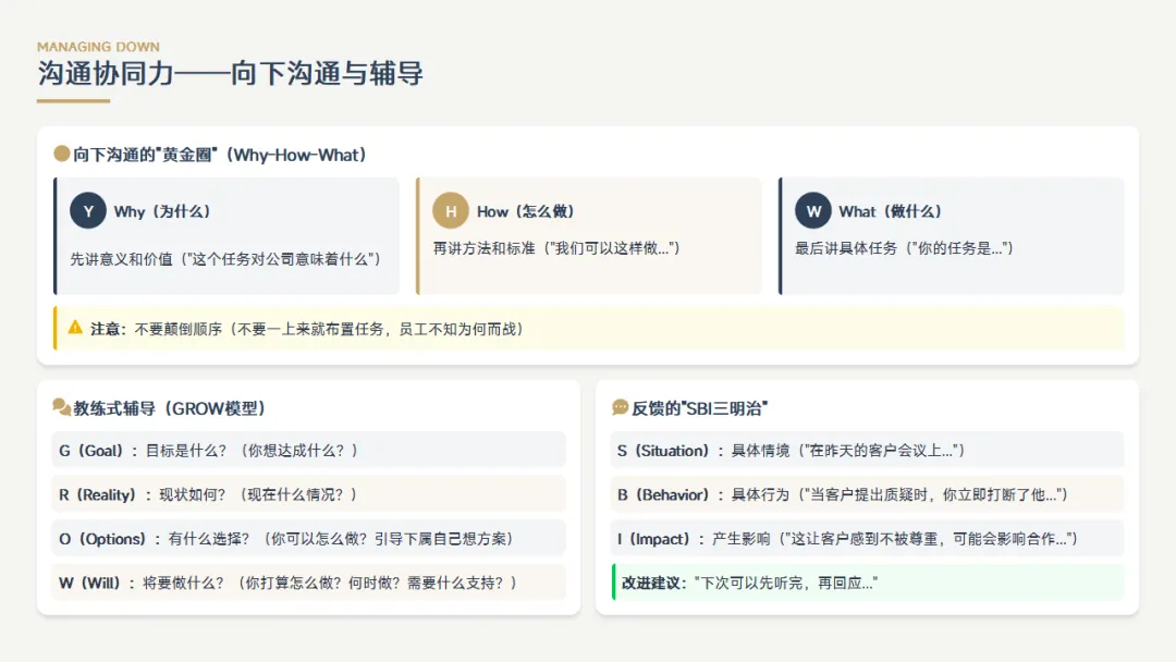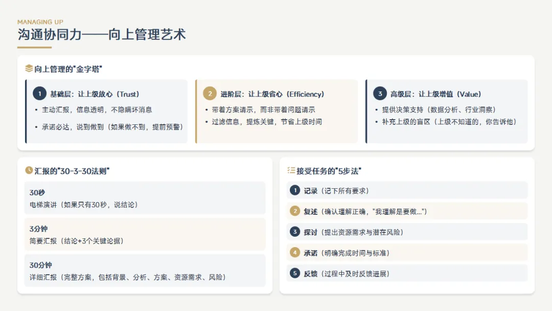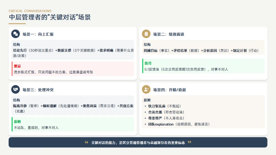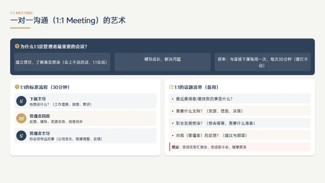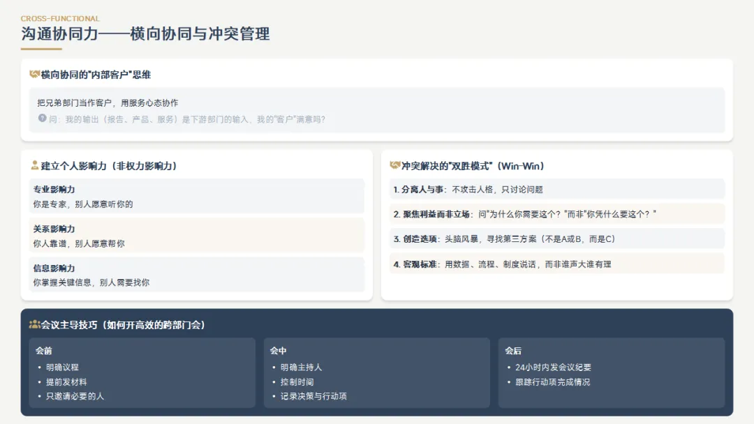 开会时是战略执行者,一对一沟通时是团队领导者,跨部门会议时是沟通协调者,推动新项目时是变革推动者。不同场景需要激活不同角色。