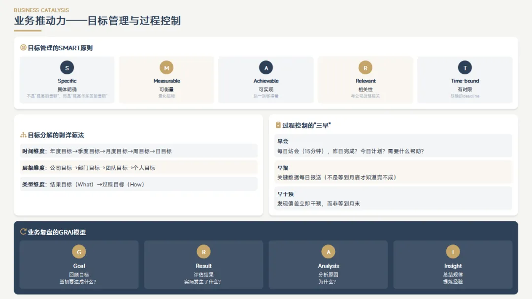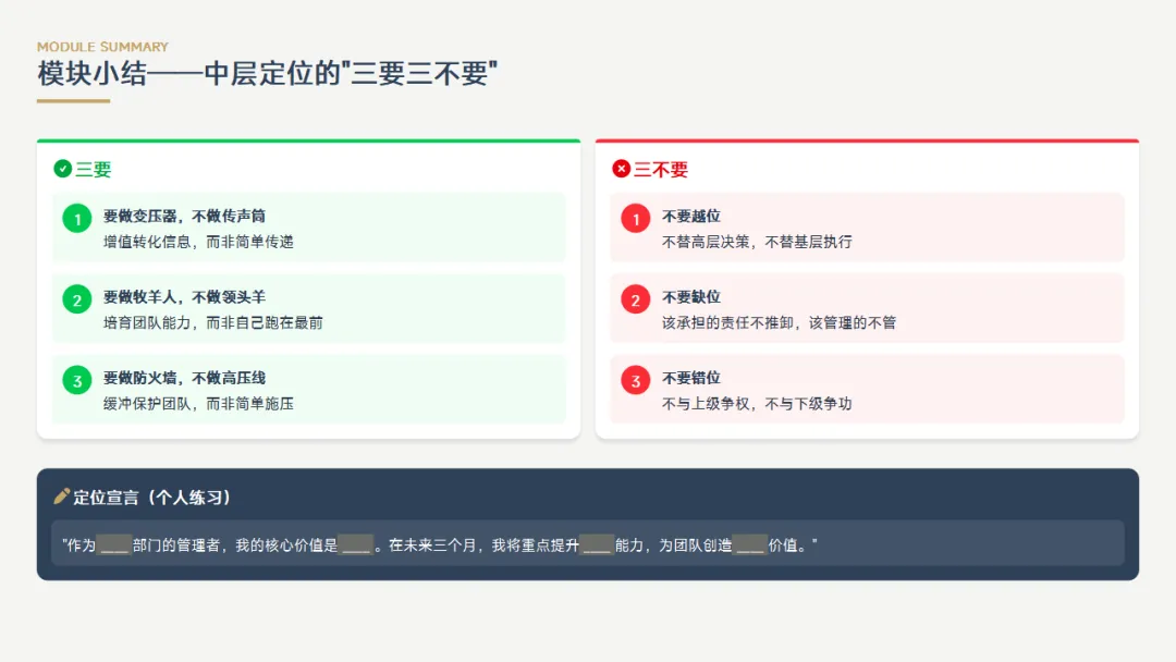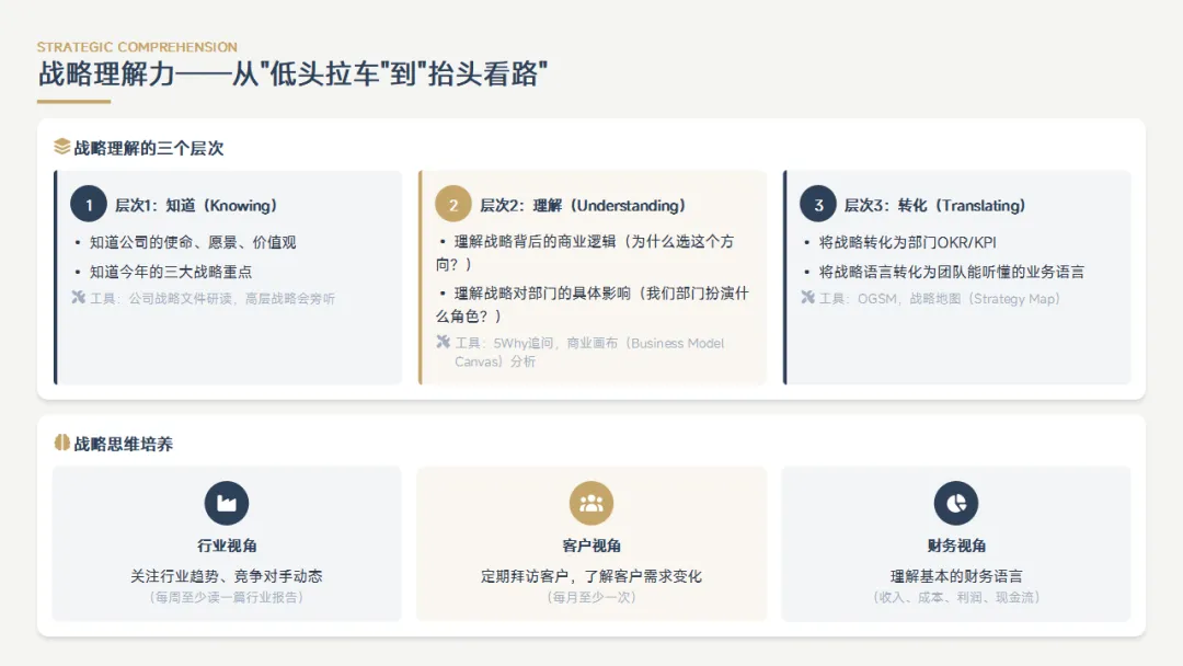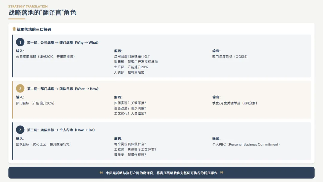 将公司战略分解为部门目标,确保"战略落地不漂移"。你们是公司战略能否落地的关键,高层再伟大的战略,如果中层执行不到位,都是空谈。