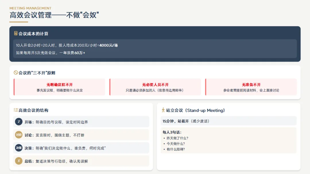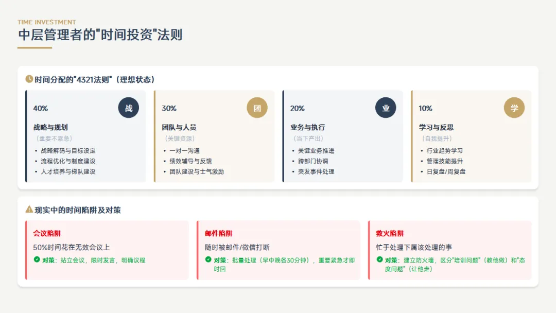 。麦肯锡的报告显示,中层管理者平均每周工作超过50个小时,其中40%的时间用于处理冲突和协调。这意味着什么?意味着你每周有两天的时间不是在创造价值,而是在处理各种扯皮、协调、救火的事情。