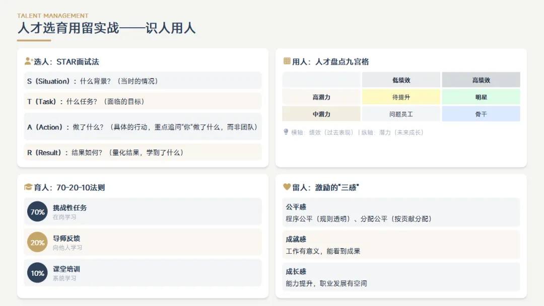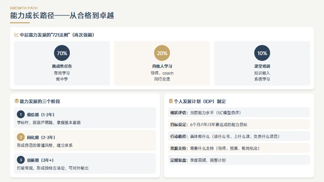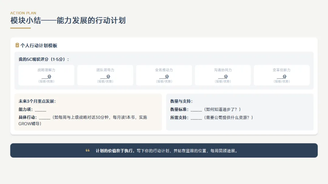 这四个维度缺一不可。战略解码力让你理解方向,团队赋能力让你拥有战斗力,业务推动力让你产出结果,文化塑造力让你持久发展。
