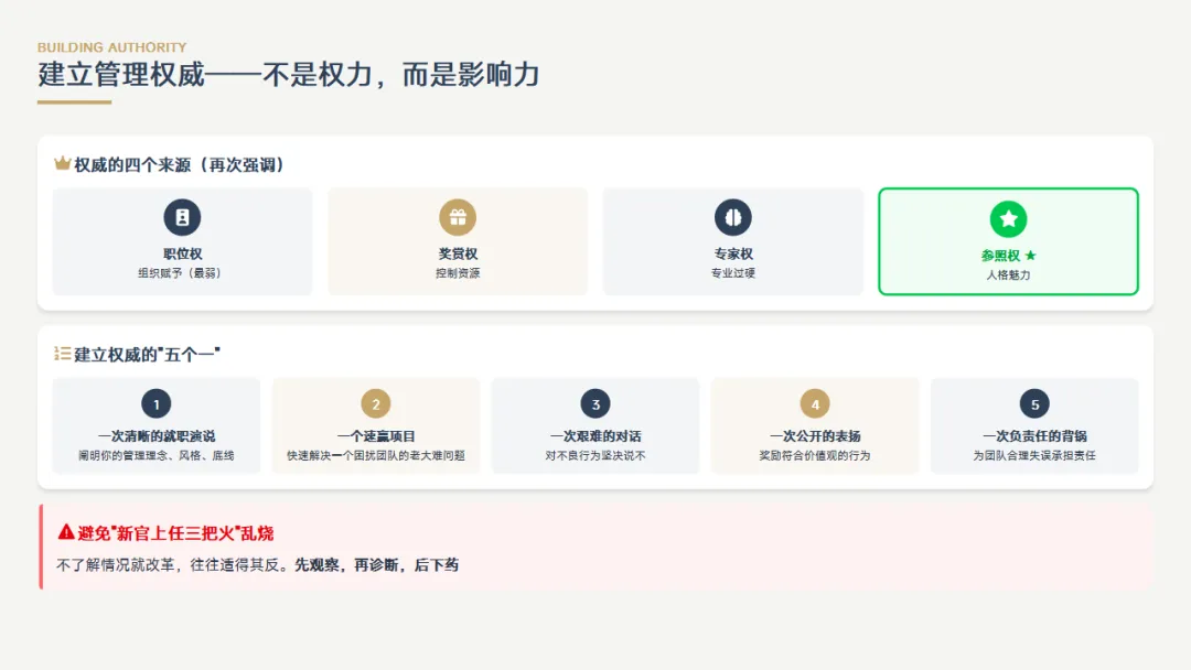 过去你是"亲自做"(Do),现在你必须"通过他人做"(Through Others)。很多新经理失败就失败在这里,他们看下属干活着急,于是抢过来自己干,结果自己累得要死,团队还没成长。