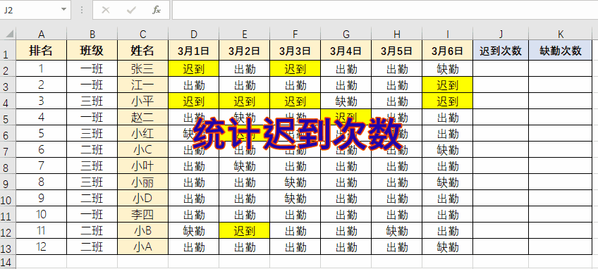 公式同上,仅选取范围不同:=countif(D2:I13,"迟到")