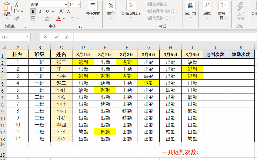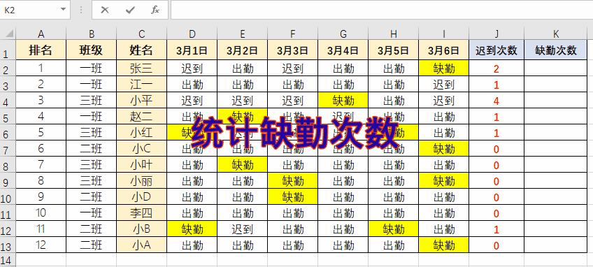 【Excel】统计考勤中的“迟到”和“缺勤”次数