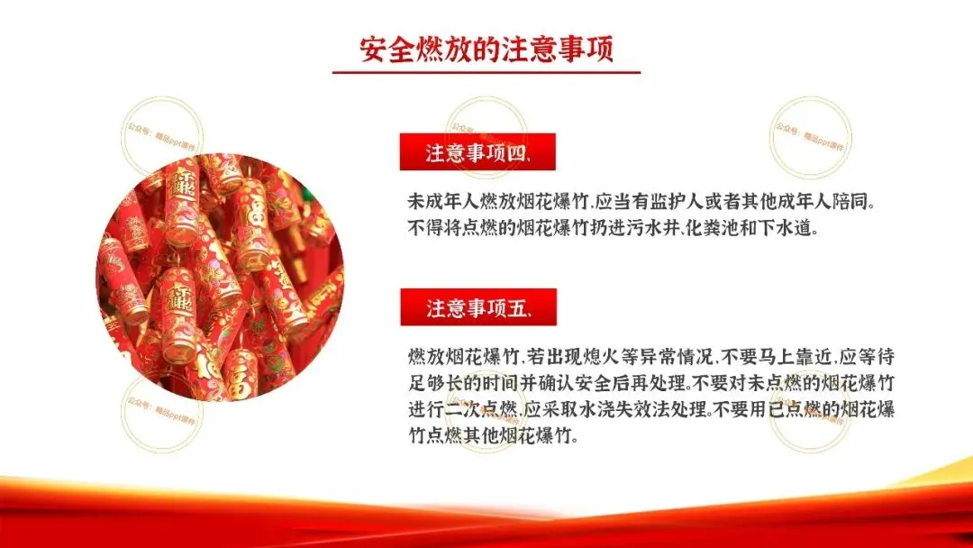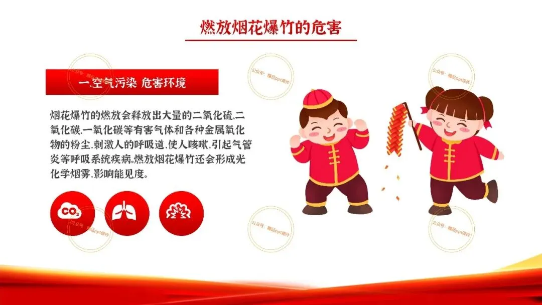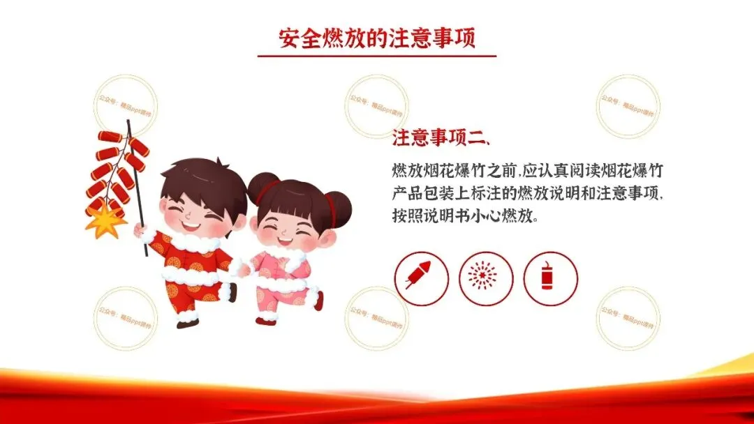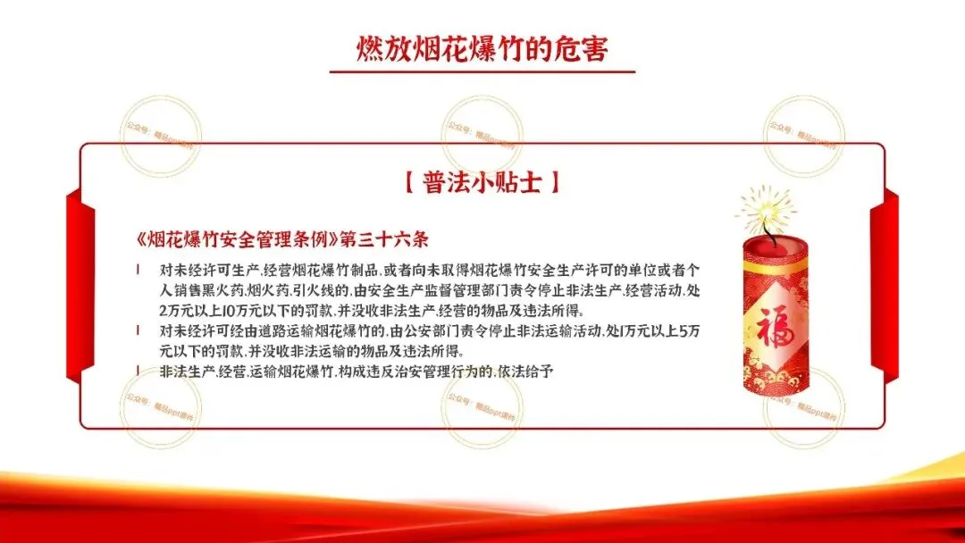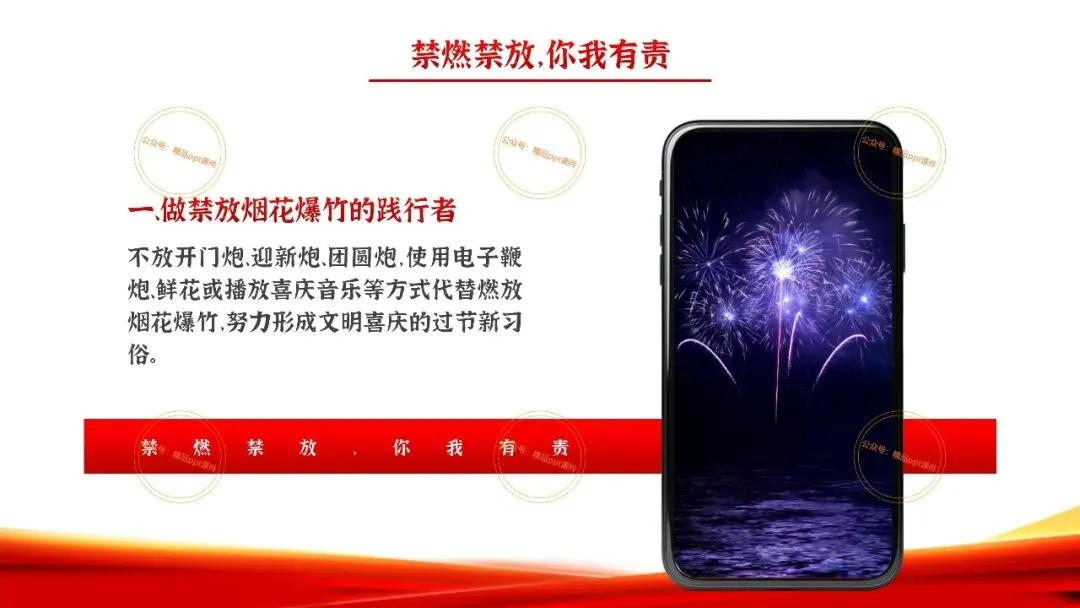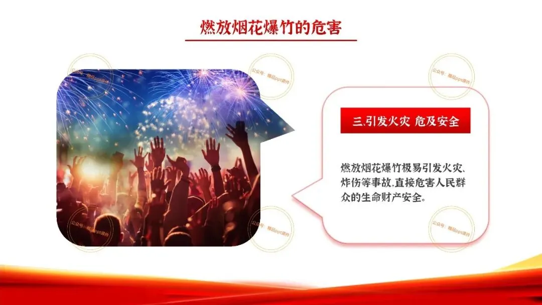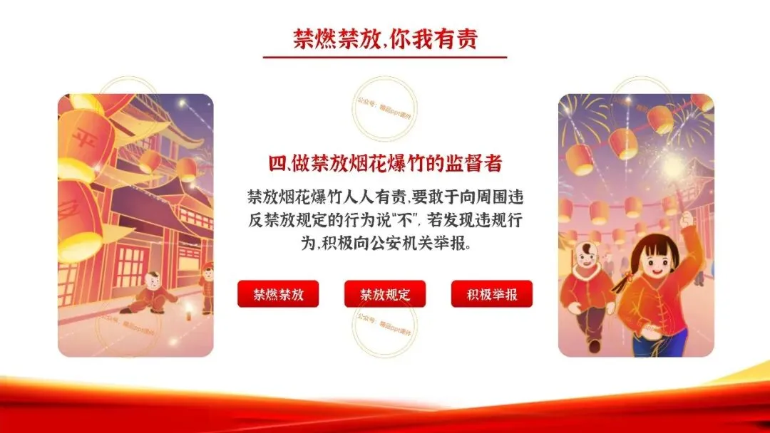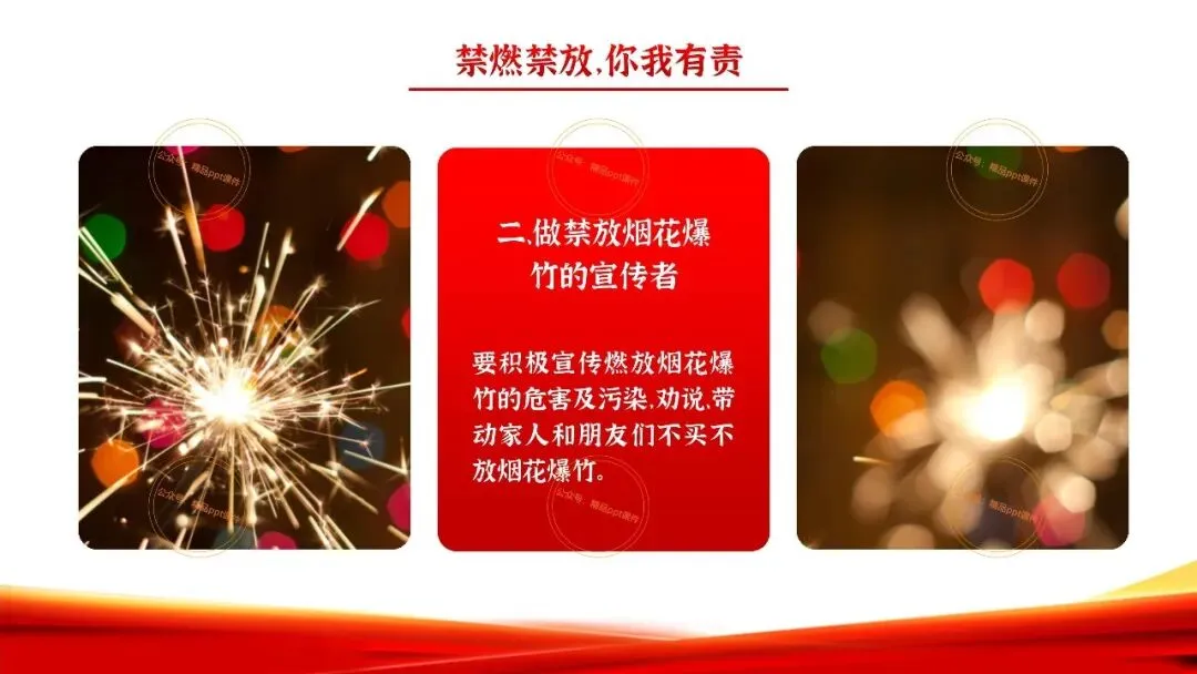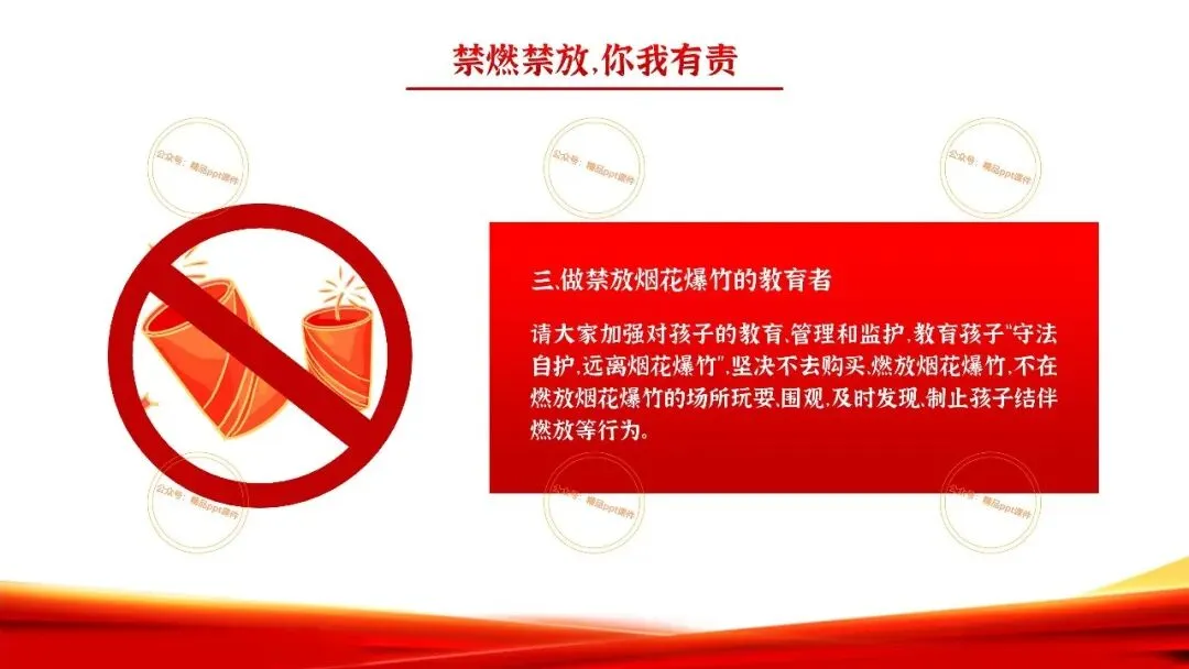2、本公众号成立的初衷是为广大ppt使用者提升工作效率,所发布的课件资源仅供学习交流禁止用于商业用途,有偿所得用来维系公众号运营所支出的人工成本,性质为买家友情赞助后获取的信息差而非售卖资源的费用。同意此声明后即可下载本期禁止燃放烟花炮竹安全教育宣传ppt课件。如有侵犯您的权利,请联系小沐老师。