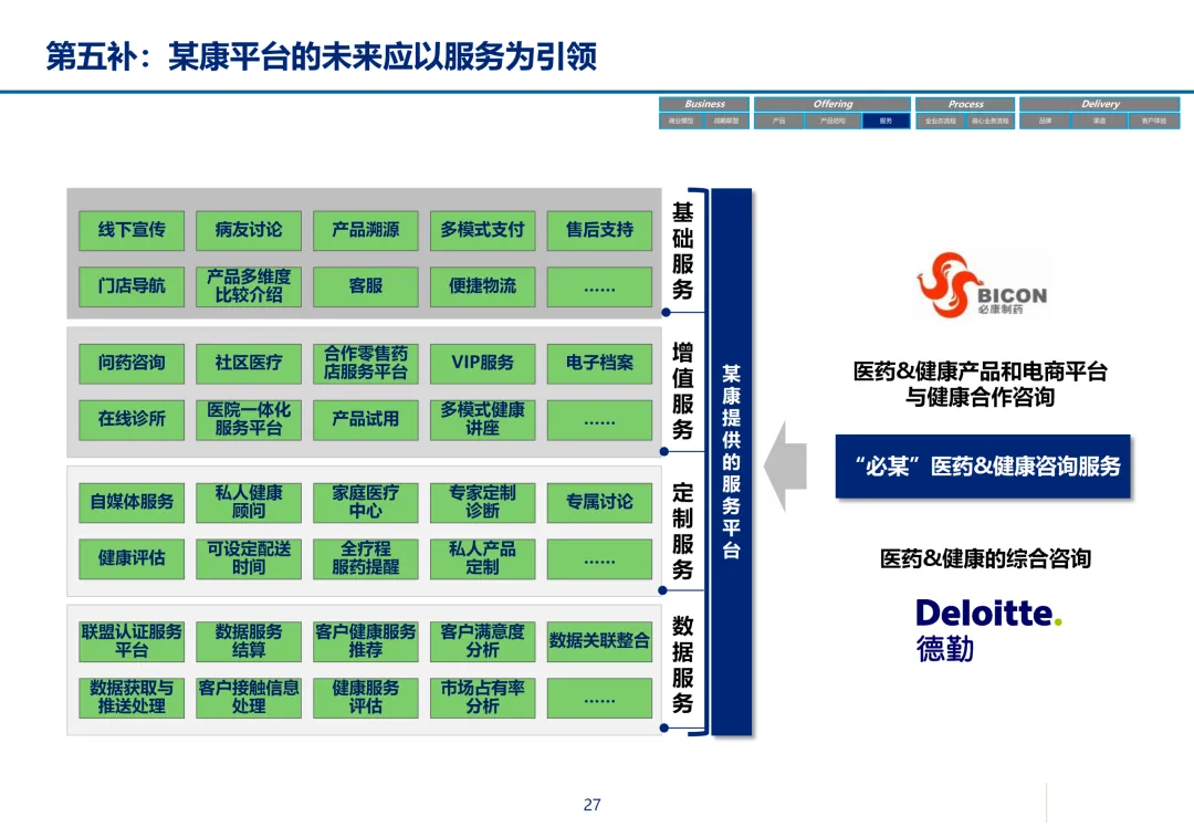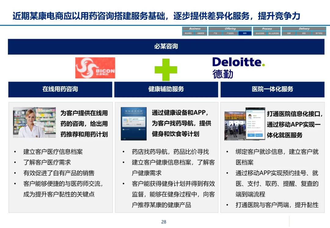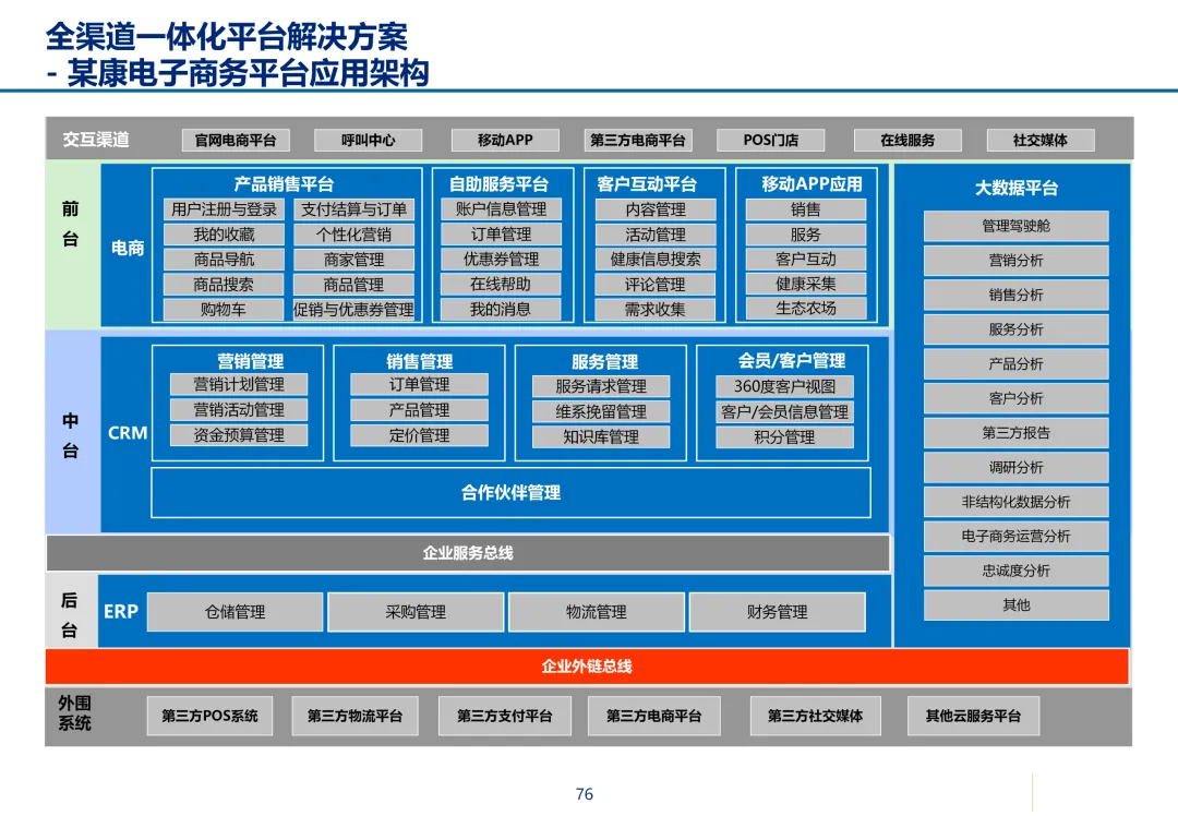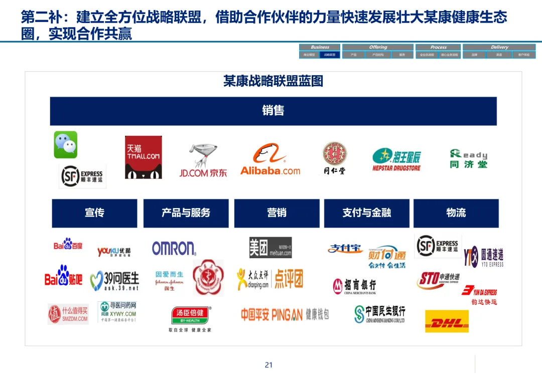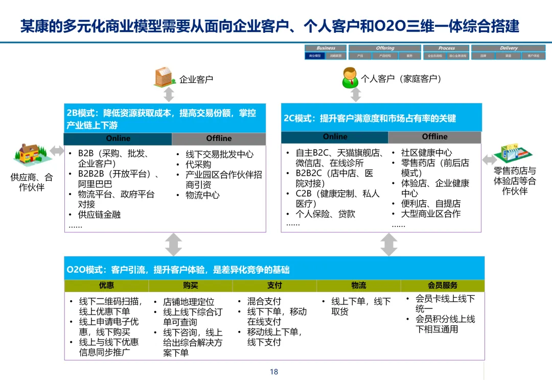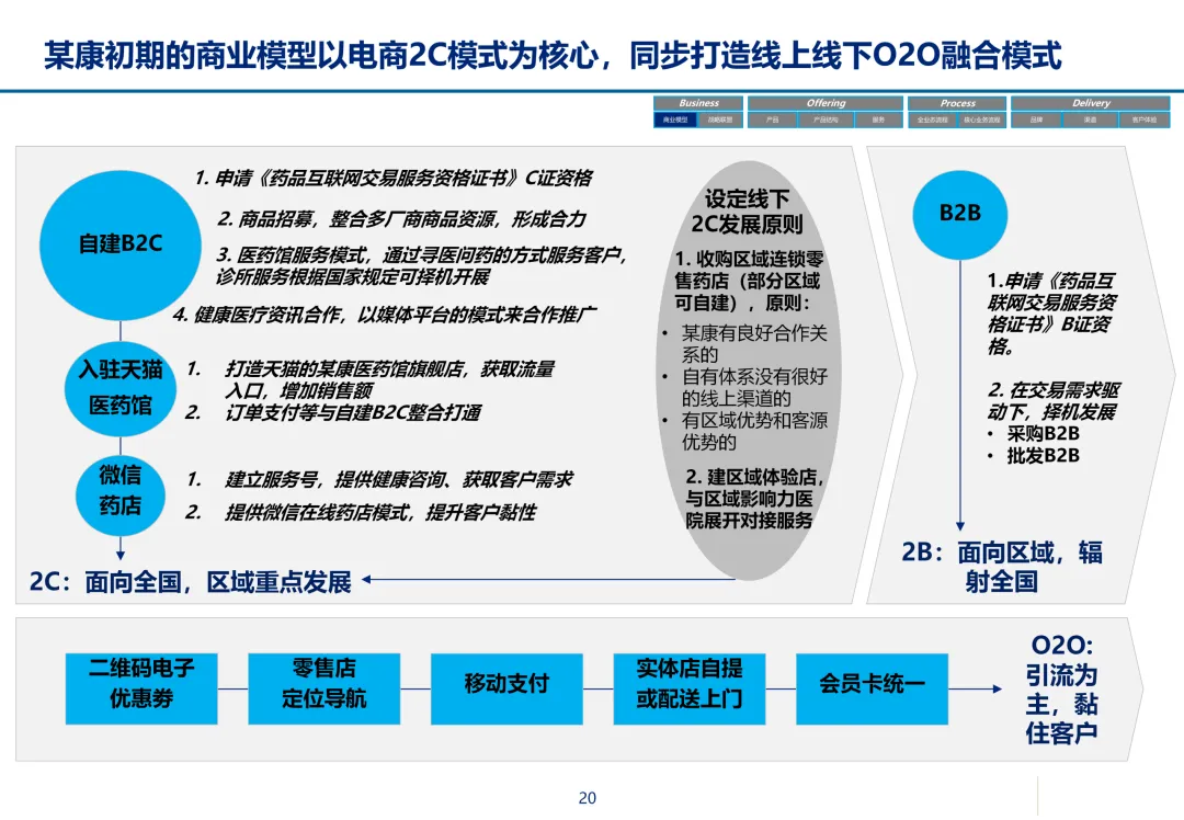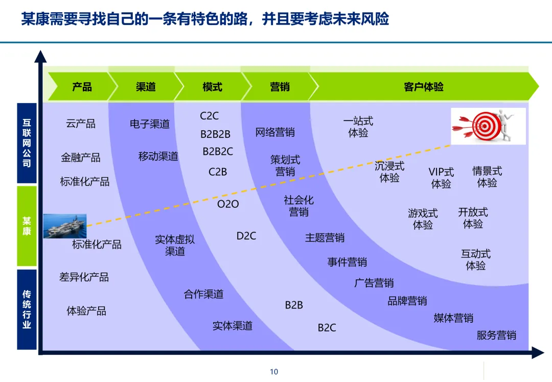 声明:本文内容来源于公众号“数字化战略咨询”,版权归原作者所有(如侵权,扫描上方二维码联系删除)。风陵渡进行深度解读,欢迎大家转载分享。最近在复盘案例时,重新翻出了一份极具代表性的传统企业数字化转型方案——某康(必康)药业的电商平台规划。尽管这份PPT距今有些年头,里面的技术架构(如Oracle ATG)也已不是市场最热门的选项,但剥开技术的外衣,其内在的转型逻辑、业务设计和方法论,对于今天任何想要进行数字化转型的传统企业来说,依然是“一字千金”的教科书。今天,我想以一个数字化顾问的视角,带大家深度拆解这份所谓的“十全大补”方案,聊聊我们能从中学到什么实用的干货。一、 为什么是“十全大补”?—— 转型不是“头痛医头”很多企业做数字化转型,容易犯一个错误:看别人做电商,我也做个商城;看别人做APP,我也上个APP。结果就是建了一堆烟囱,业务却跑不起来。这份方案的高明之处,在于它开篇就定了一个基调:“私人定制:十全大补”。 它把企业转型比作一个人需要全面调理,而不是只吃一片止痛药。这“十补”涵盖了商业模式、产品、服务、流程、品牌、渠道、体验、IT等方方面面。它告诉我们一个朴素的真理:数字化转型是一把手工程,是战略级的重构,不是IT部门能独立完成的“网站改版”。 作为数字化顾问,我们在推动项目时,如果不能让企业高层理解这种“系统性”的变革,项目大概率会在各部门的扯皮中夭折。二、 最值钱的“两补”:商业模式与客户体验在“十全大补”中,我认为最有价值、最能体现咨询功底的是“第一补”和“第十补”。方案没有只盯着自建B2C,而是提出了一个非常务实的组合拳:自建B2C + 入驻天猫 + 微信药店 + 线下并购/O2O。对数字化顾问的启示:不要为了追求技术的“纯自研”或模式的“高大上”而忽略现实。对于传统企业,流量在哪,我们就应该去哪。自建平台是“根据地”,入驻第三方是“前沿阵地”,线下门店是“后勤补给站”。这种多维度的商业模型,既解决了生存问题(销售),又解决了发展问题(私域流量),是真正的“稳健打法”。方案里引用了一个“茶叶”的例子:产品 -> 商品 -> 服务 -> 体验,价格指数级上升。这个例子太经典了。对数字化顾问的启示:我们经常和企业讲“以客户为中心”,但怎么落地?这个例子给出了路径。对于医药行业,“可信、方便、无约束” 这七个字直击痛点。可信:不仅是正品,更是通过个人病历、药师咨询建立的专业信任。方便:不仅是送货上门,更是全渠道的无缝切换、一键购药。无约束:不仅是积分通用,更是通过大数据预测你的健康需求,服务在你开口之前。数字化不是炫技,而是要通过技术手段,消除客户在购买决策过程中的每一个疑虑和不便。这才是体验设计的核心。三、 从“十全大补”中提炼的“数字化转型三问”基于这份方案,我认为任何传统企业在启动数字化项目前,都必须想清楚三个问题:第一问:我们的“航行目标”是什么?是卖货,还是服务用户?某康的目标很清晰,不是简单地把药从线下搬到线上,而是打造“健康电商航母”,服务上亿人。这意味着它的系统架构、数据模型、业务流程,都要围绕“个人健康”这个长周期来设计,而不是围绕“单次药品交易”这个短行为。目标是服务的,最终会做成平台;目标是卖货的,最终只是个网店。第二问:我们的“航海图”如何规划?是一步到位,还是小步快跑?方案给出了清晰的三步走:平台建设期(建能力)-> 完善提升期(拓渠道)-> 产业链整合期(建生态)。这是非常经典的“由内而外、由点到面”的实施路径。第一阶段:先把线上B2C跑通,哪怕有人工介入,关键是验证模式。第二阶段:打通ERP和电商,实现自动化,并开始接入各种第三方,获取流量。这种分阶段的演进,既控制了投资风险,也让团队在每个阶段都有明确的里程碑,是项目成功的关键。第三问:我们的“舰载武器”如何选型?是追求先进,还是追求适配?方案在IT架构部分,非常务实。它推荐了Oracle成熟的套装软件,并给出了详细的物理部署和资源估算。对数字化顾问的启示:不要为了简历好看而盲目推崇开源或最新的技术。对于传统企业,特别是医药这种对数据一致性、事务处理要求极高的行业,成熟、稳定、可扩展是第一位的。在“双11”大促时能扛住压力,比用了某个最新的国产数据库更实际。方案中提到的 “Partition Everything, Cache Everything, Async Everything” 这四大设计原则,是所有高并发系统架构的金科玉律,至今不过时。【未完...】