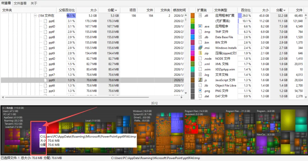 这些文件大多是 tmp 格式的临时文件,平时藏在隐藏文件夹里,根本找不到,日积月累下来,就是 C 盘的 “空间黑洞”,做 PPT 越频繁,囤积的垃圾就越多!