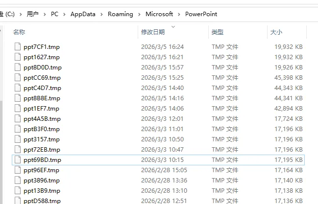 打开文件夹后,你会发现全是一堆看不懂的 tmp 文件、临时演示文稿,这些都是可以放心删除的 “安全垃圾”,全选(Ctrl+A)→删除,一气呵成!⚠️ 小提醒:删除前确保 PPT 软件已经关闭,避免误删正在编辑的临时文件。