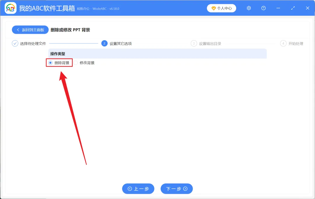打开【我的 ABC 软件工具箱】,选择【文件内容】-【PPT】-【删除或修改 PPT 背景】。