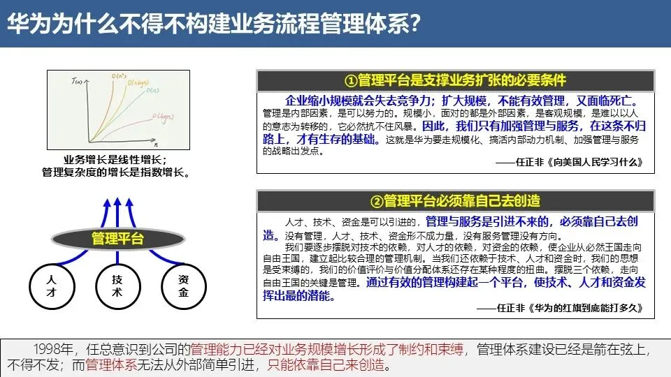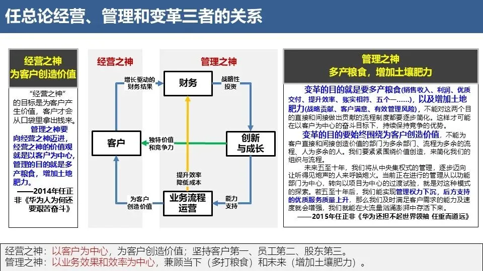华为流程管理体系的核心是通过系统化的流程建设,将企业从“对人负责”转向“对事负责”,从“职能为中心”转向“流程为中心”,从“个人英雄主义”转向“组织能力”。其本质是构建一套能够持续为客户创造价值、高效配置资源、快速响应变化的运营体系,最终实现“多打粮食,增加土地肥力”的经营目标。