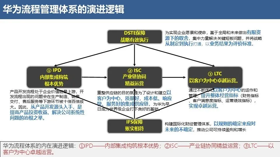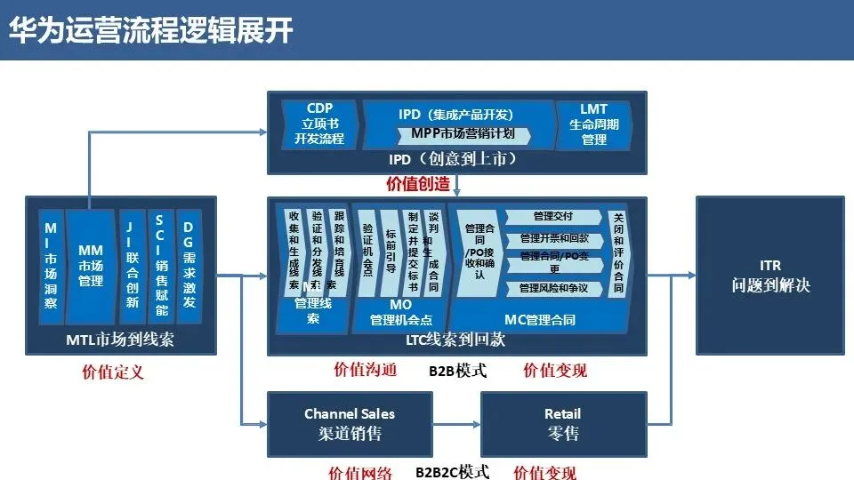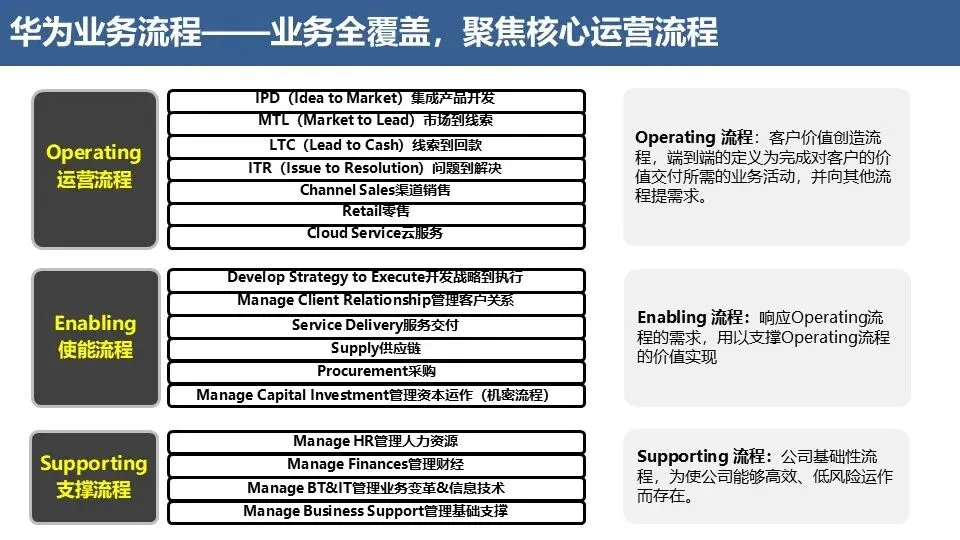 运营流程(Operating):客户价值创造流程,端到端完成对客户的价值交付(如IPD、LTC、ITR)。