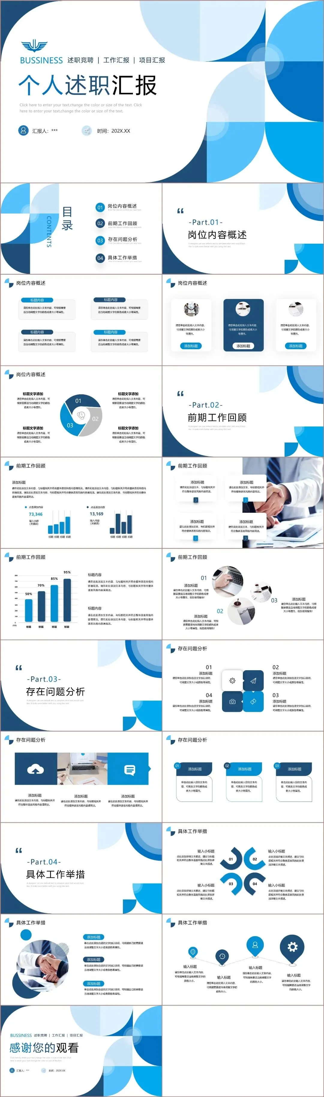 页数与结构:模板共包含约15至20页,结构完整且逻辑严密。严格遵循“岗位内容概述 → 前期工作回顾 → 存在问题分析 → 具体工作举措”的标准述职框架。主要页面包括: