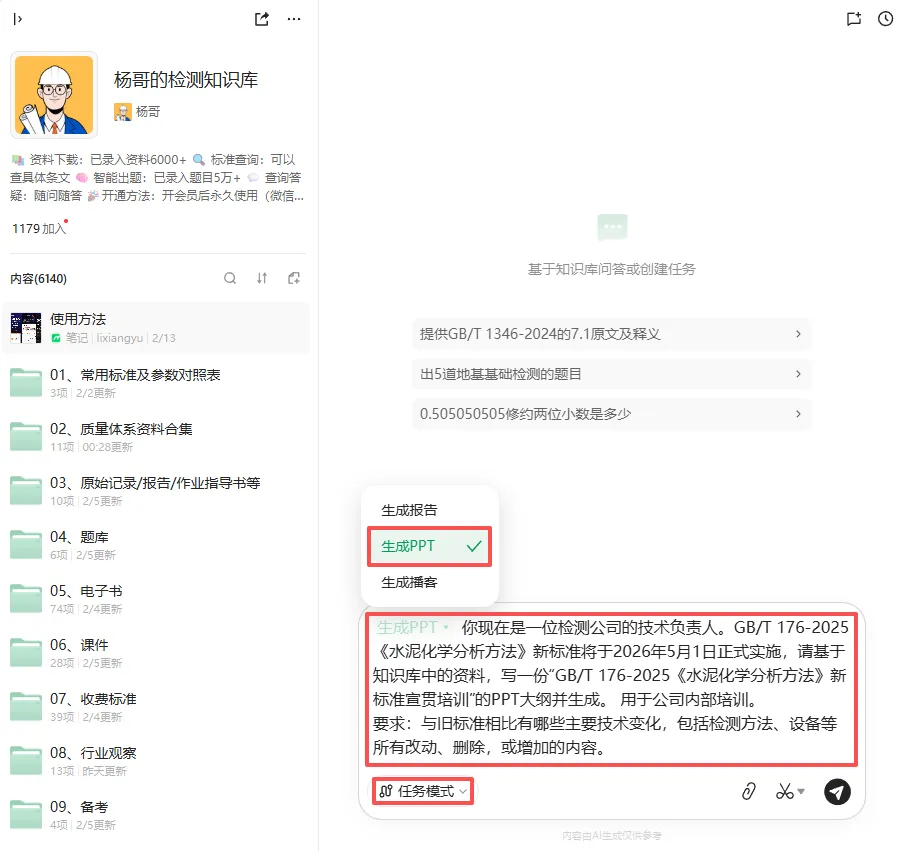 如果嫌麻烦,或者缺少资料,可以加入杨哥的检测知识库,直接使用,里面有6000+份检测资料,新标准、新政策、报告模板、作业指导书、体系文件等都有,课件和试卷的质量主要就取决于这些资料的质量,这个检测知识库已有1000多人加入,后面有加入方法。