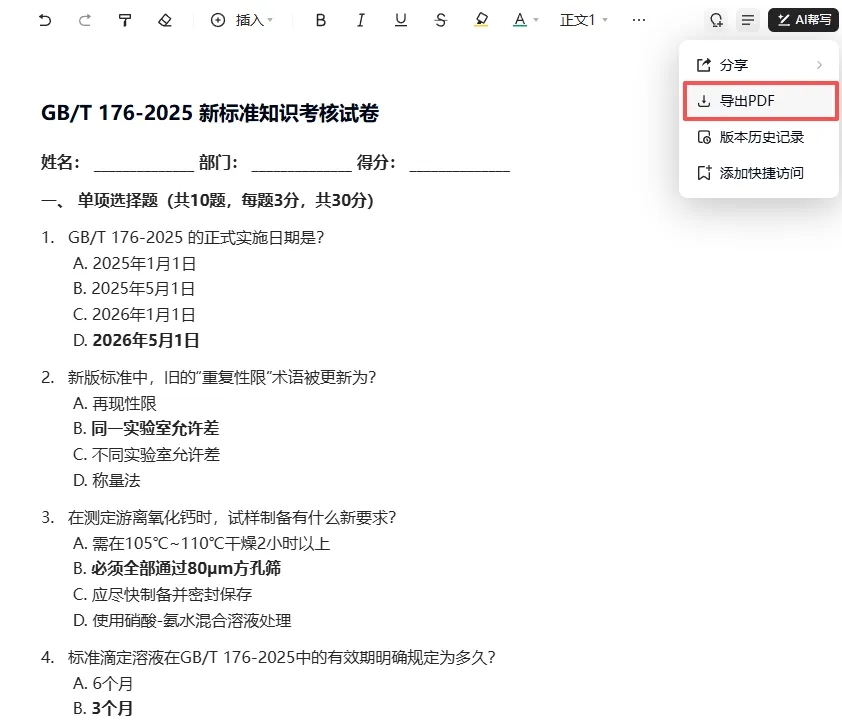 你现在是一位检测公司的技术负责人。请基于这个文档,出一份“GB/T 176-2025《水泥化学分析方法》考核卷”,用于公司内部培训后的考核。