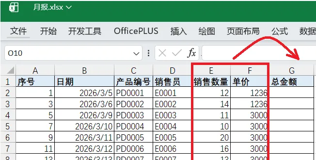如下图所示表格中,E列是“数量”,F列是“单价”,需要在G列通过公式计算每一行的“总金额”(如G2填充公式“=E2*F2”),并要求自动填充至表格数据的最后一行