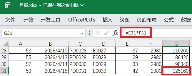 Sub AutoFillFormula() Dim ws As Worksheet Dim LastRow As Long ' 设置目标工作表:当前活动工作表 Set ws = ActiveSheet ' 动态获取A列(或任意基准列)最后一个非空单元格的行号 LastRow = ws.Cells(ws.Rows.Count, "A").End(xlUp).Row ' 在G2单元格写入初始公式 ws.Range("G2").Formula = "=E2*F2" ' 使用AutoFill方法将公式从G2填充到G列的最后一行 ws.Range("G2").AutoFill Destination:=ws.Range("G2:G" & LastRow), Type:=xlFillDefault ' 保存工作簿:当前活动工作簿 ActiveWorkbook.Save MsgBox "公式已自动填充至第 " & LastRow & " 行。", vbInformationEnd Sub