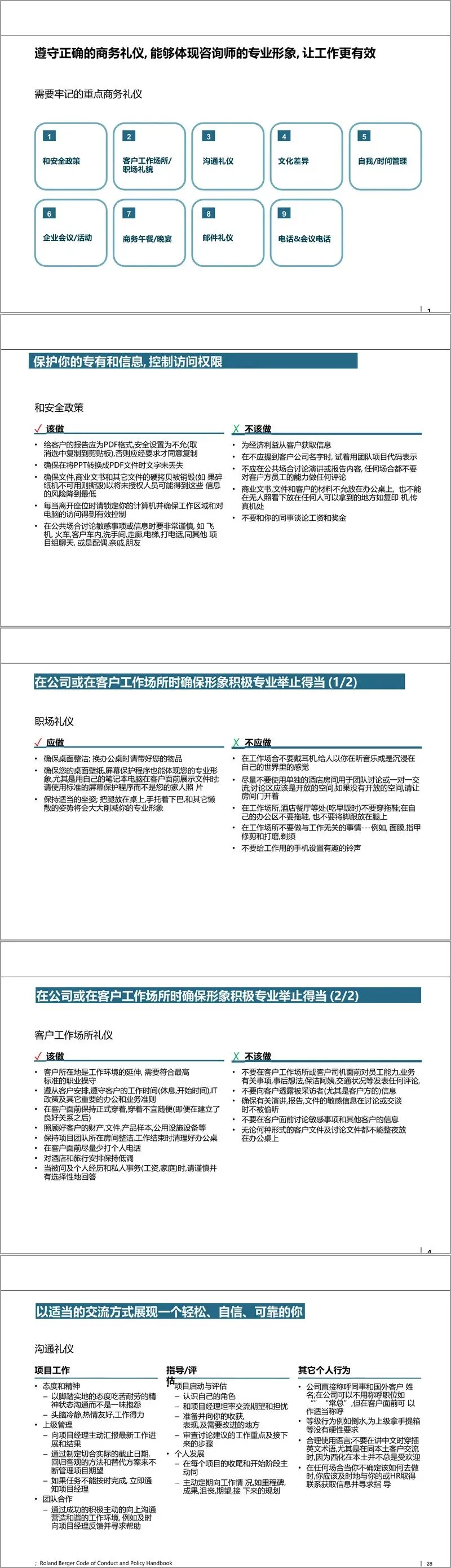本培训指南系统性地构建了咨询顾问从职业素养到项目实战的全方位能力框架。开篇即强调专业形象是咨询顾问的立身之本,从着装规范到商务礼仪,手册事无巨细地提供了行为准则。着装部分指出,咨询顾问是公司的品牌大使,专业形象能直接建立品牌资产,手册详细区分了男女职业装的标准,甚至细及发型、妆容、配饰的得体选择,明确禁止牛仔、T恤等休闲服饰。商务礼仪章节则涵盖了沟通礼仪、时间管理、客户场所行为规范、会议及电话礼仪等,特别强调了向上管理的重要性,即如何主动与项目经理沟通期望、汇报进展,从而高效推进工作。