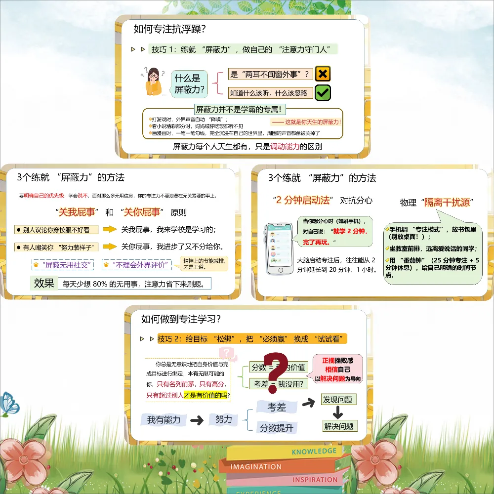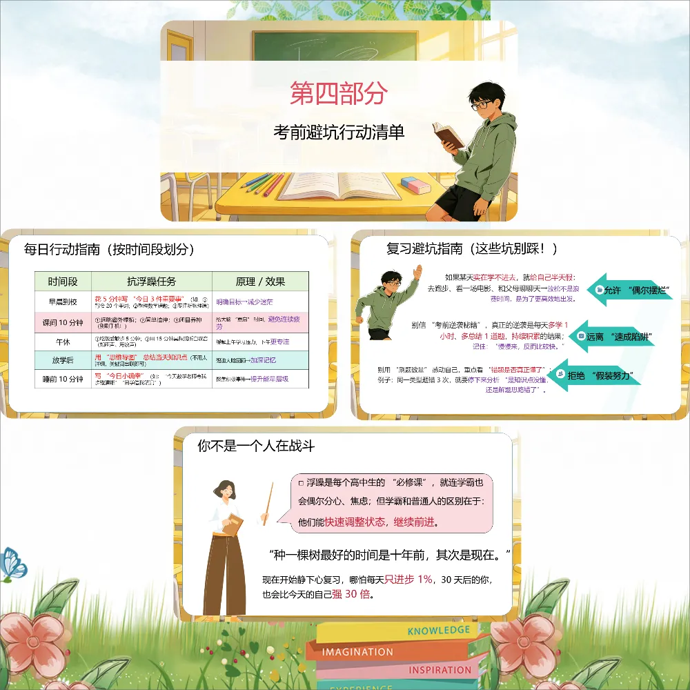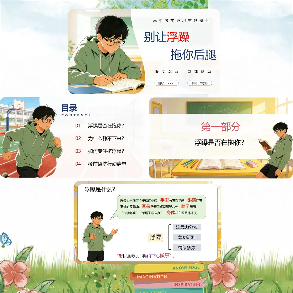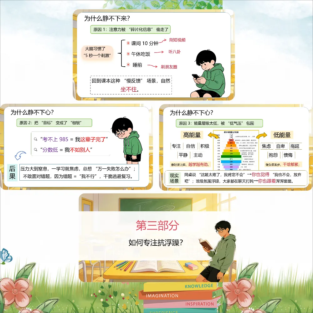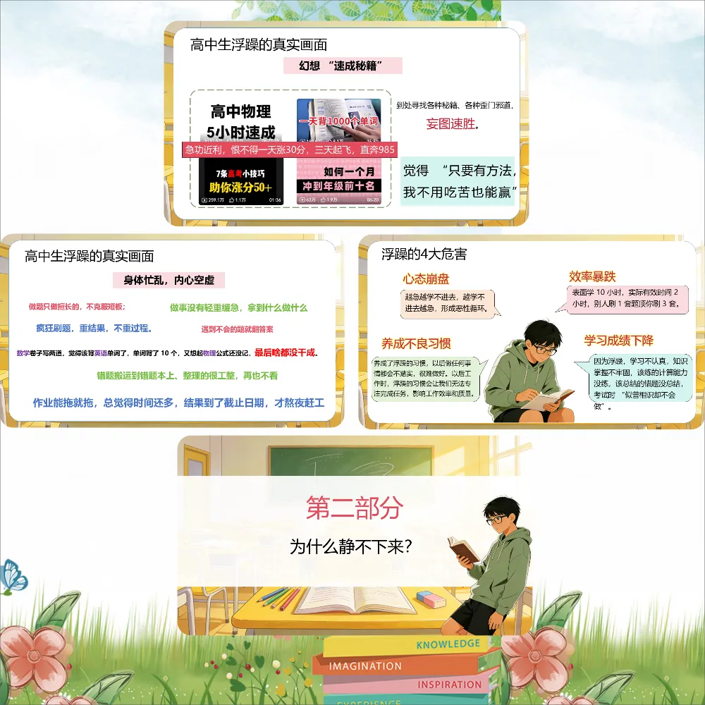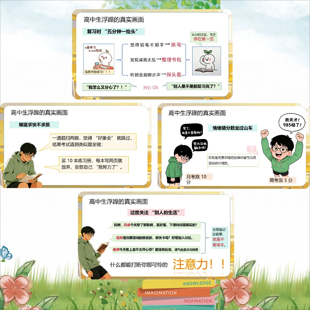 更可怕的是,浮躁会传染。同桌说"这题太难了,放弃吧",你也跟着觉得"我也不会";课间大家都在闲聊打盹,你也跟着浑浑噩噩。等你反应过来,半个月过去了。