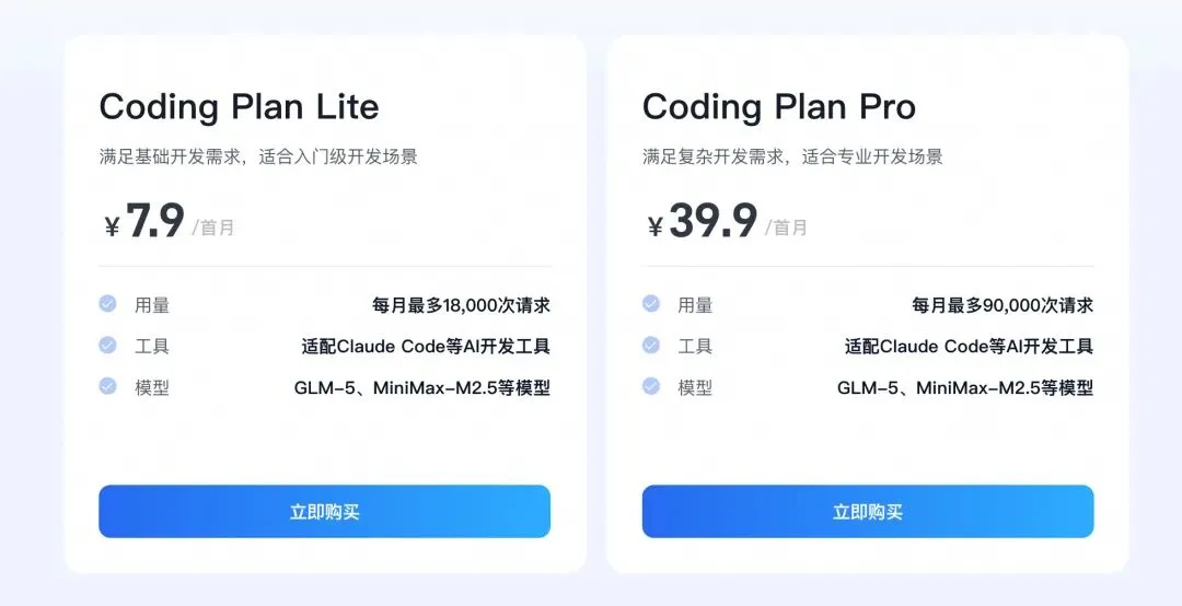 Coding Plan 计划支持了包括 DeepSeek-V3.2、GLM-4.7、Kimi-K2.5、MiniMax-M2.1、MiniMax-M2.5、GLM-5 这六款模型。