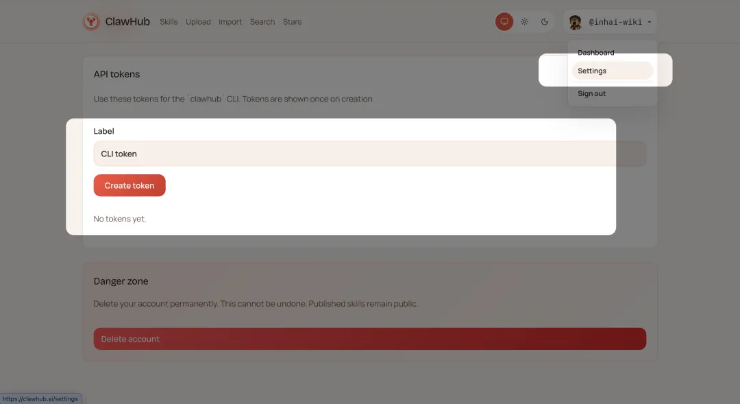 并从 Settings 里面获取到 Clawhub 的 token 信息。