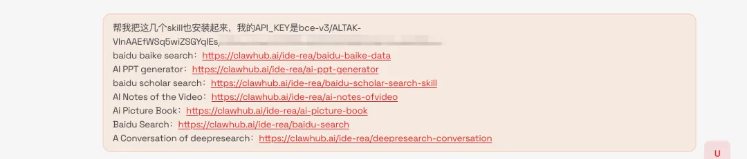同时呢,百度官方也本身提供了非常多的优质Skill,我这里整理了一些,大家直接复制粘贴,给到咱们的小龙虾让它去安装就好了。