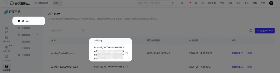同时如果需要使用的话,咱们还是需要告诉小龙虾对应的 API_KEY 信息,具体获取可以到控制台中「API Key」处获取具体的信息值。