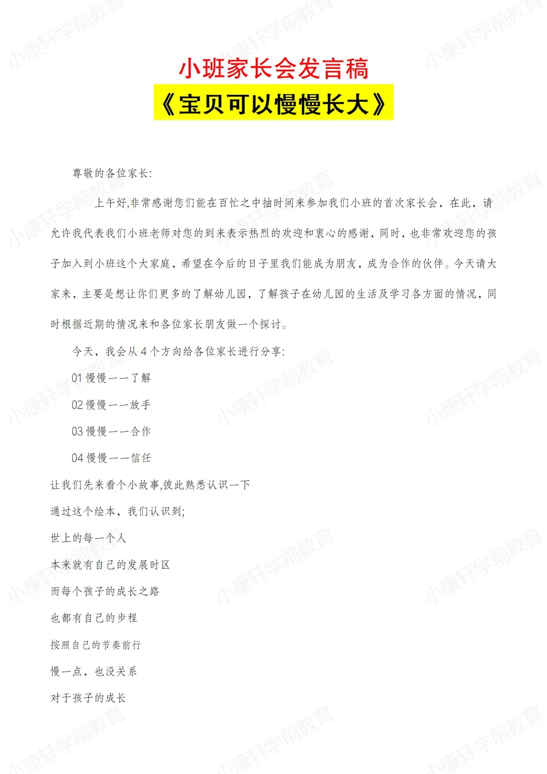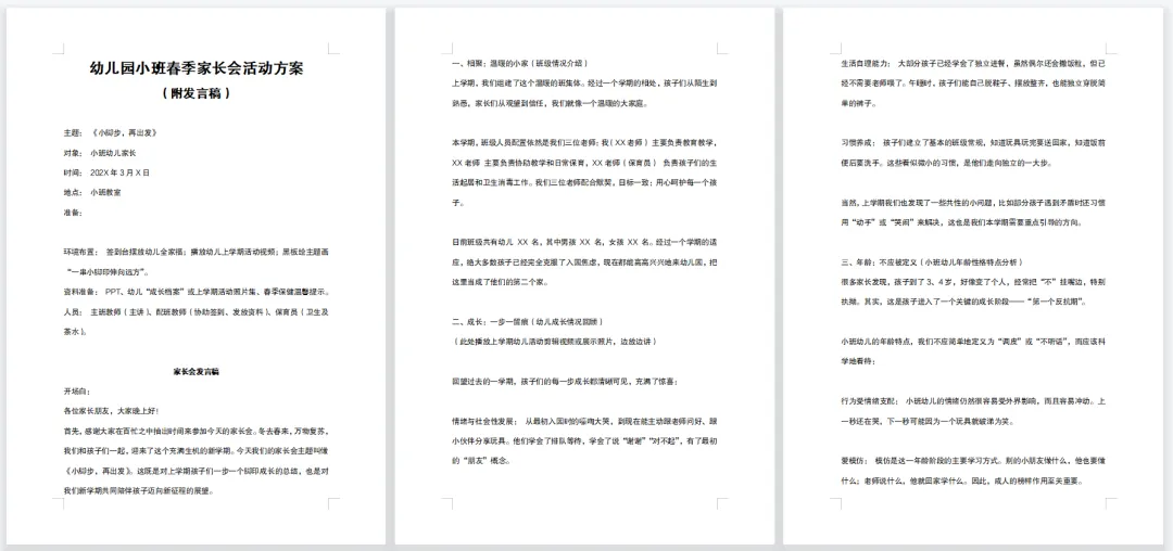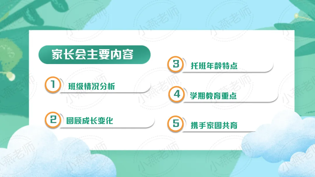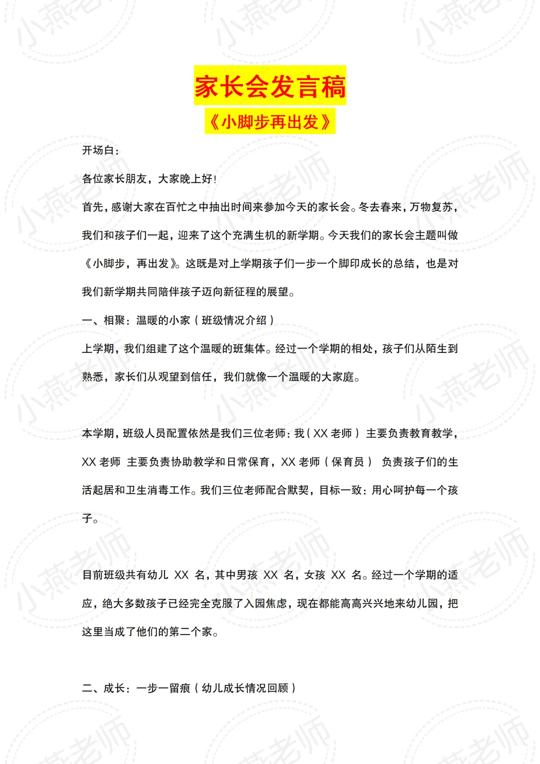 时间过得真快,转眼间幼儿园的新学期即将拉开帷幕。我们的宝贝在各个方面都获得了许多收获,于是春天里的第一场家长会,总是充满了温柔与期待。为了助力托/小/中/大班的老师们开好春季新学期的家长会,小燕老师整理了【幼儿园春季开学家长会资源包】包含:流程方案+发言稿+PPT+邀请函(文末下载领取完整版),希望能助老师们一臂之力!△文末下载领取《春节开学托小中大班家长会资源包》流程方案及发言稿全套电子档附家长会相关资源