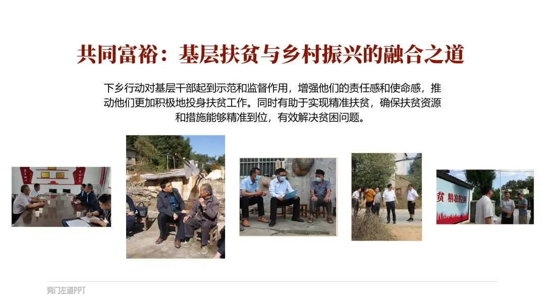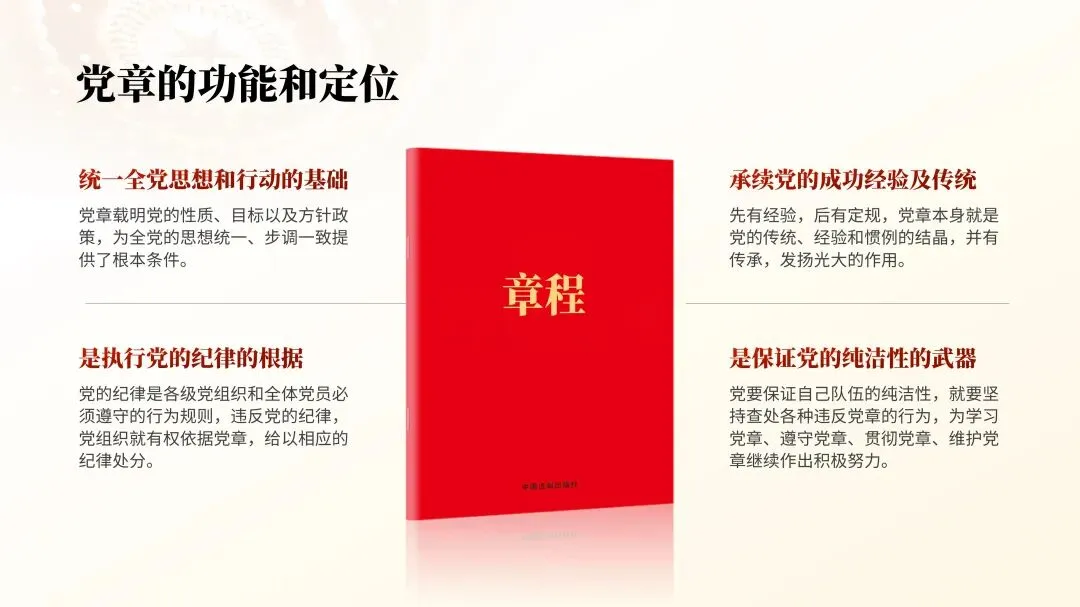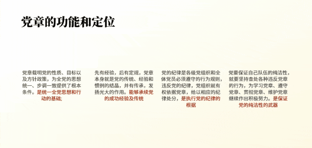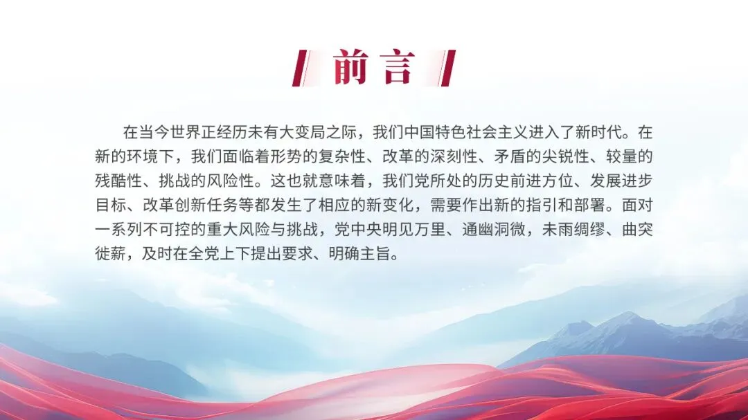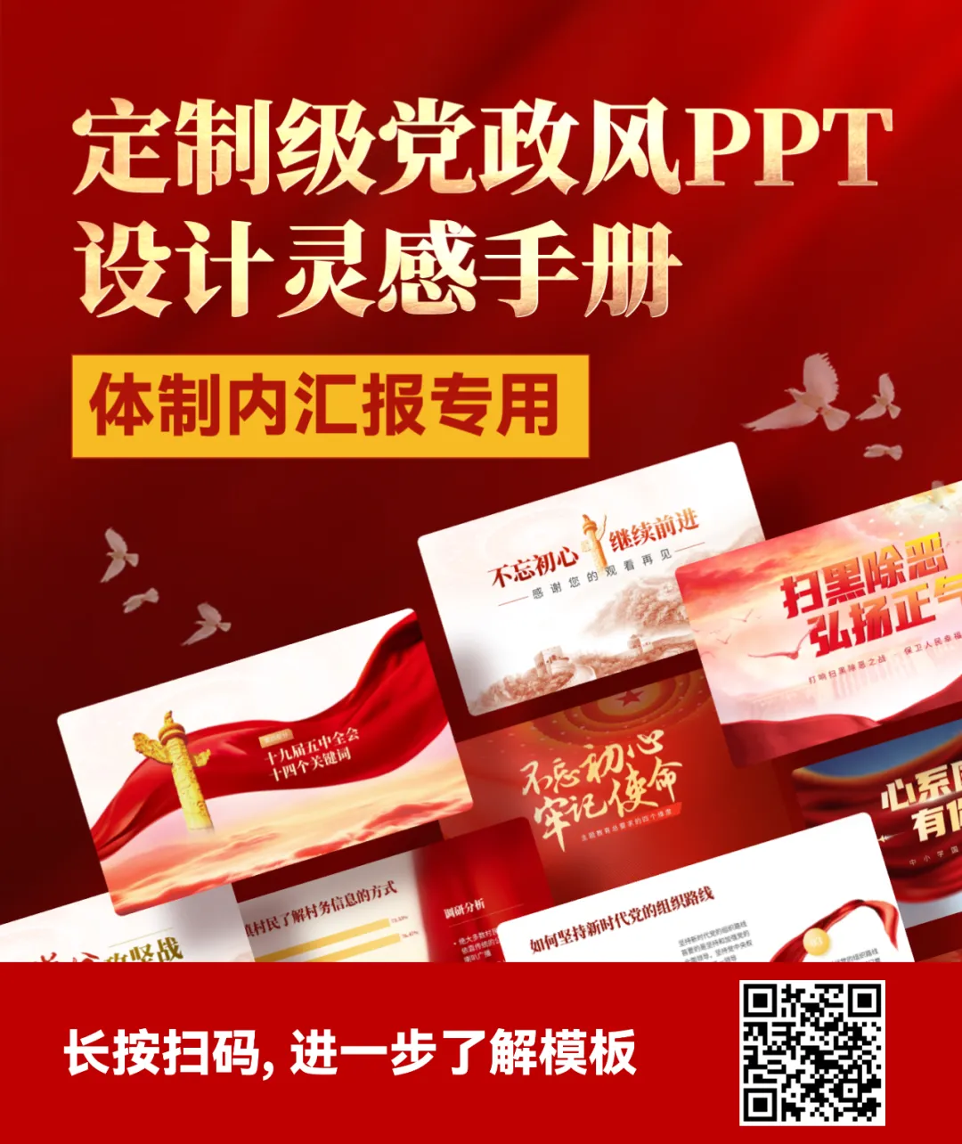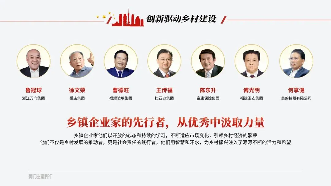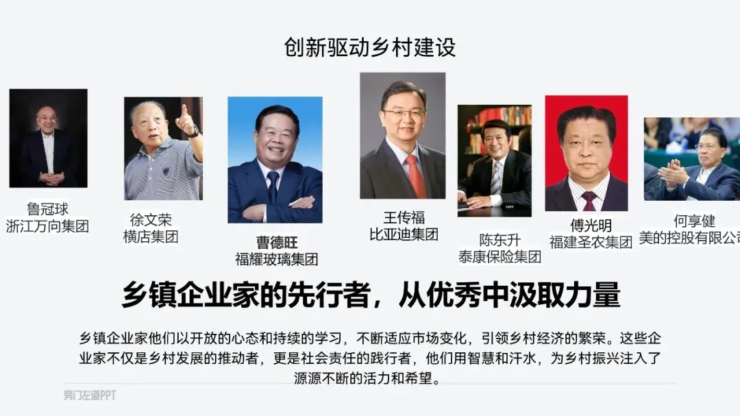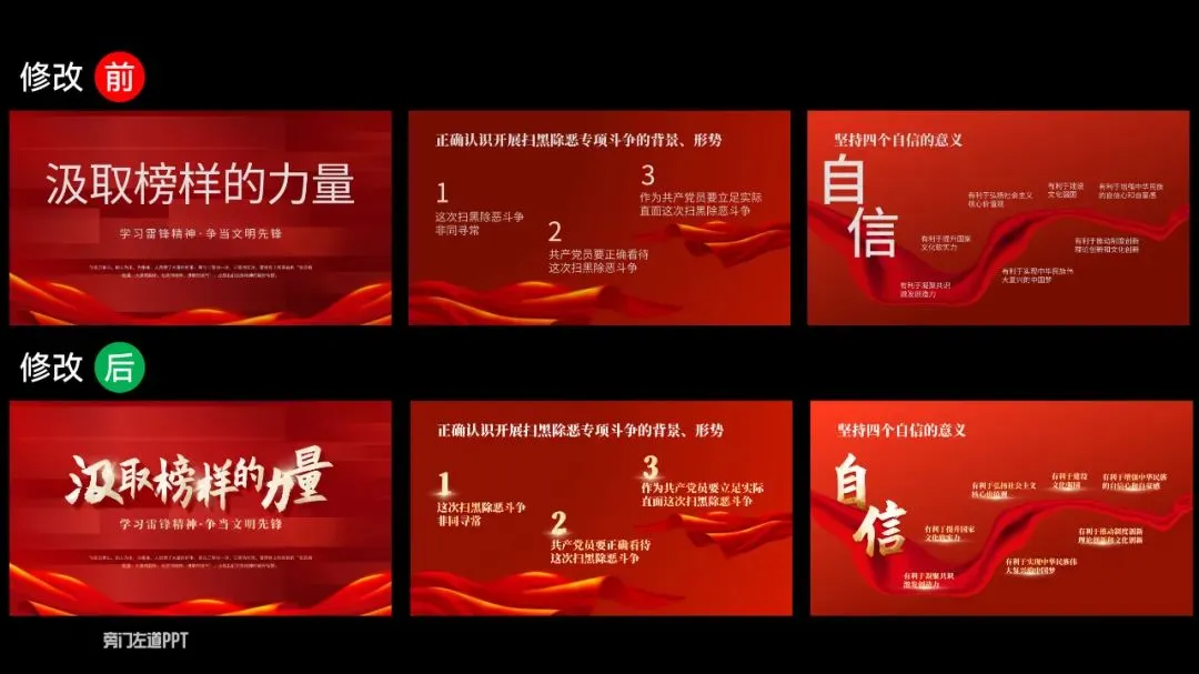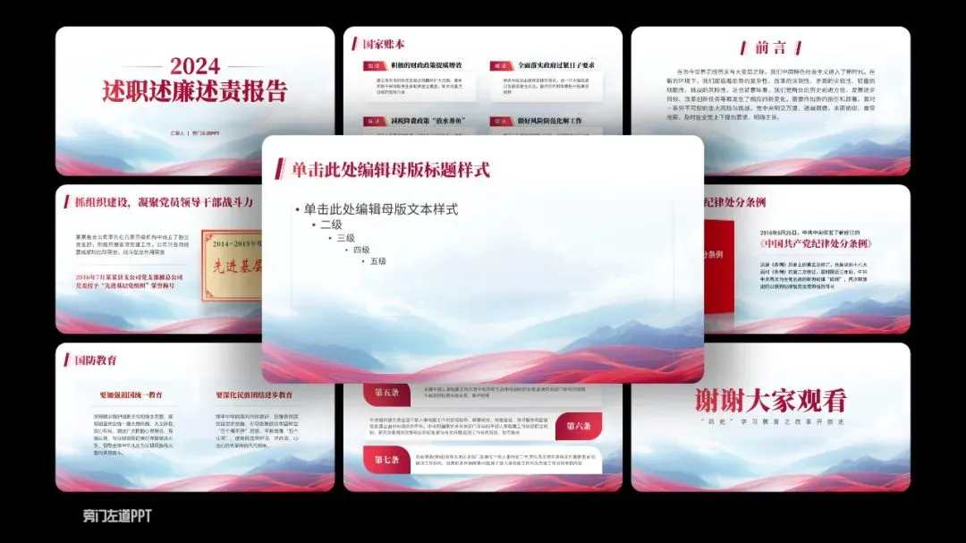 如果是遇到多点内容页,每个小点还都很重要!那就直接利用色彩搭配,来模拟出金属的质感:咋做呢?在渐变色条上新建五个光圈,按照亮暗亮暗亮来分配颜色,就可以做好啦:要是遇到页面全是文字的,除了字要亮,更关键是内容要有逻辑,汇报才能显得更用心!那到底咋做呢?然后找到句子的主干,单独拎出来当作小标题摆放,做好信息的梳理:当然,你还可以垫上几个纯色的形状,这样就可以让长短不一的段落看起来更加整齐,也更有创意:如果给单位一把手,或厅级领导做PPT的话,那PPT的要求更高了!要吸睛还要能配合演讲!想把对外展示的关键素材排版好,还得靠这根祖传的绸缎才行:像这种经常用但排版起来很头秃的证件照,教你用红绸做高级!接着在人物图上放一个圆,先选中图片,再选中圆形,在形状格式选项卡中找到相交,人物照片的底部就变成了圆形:一般领导到这里就够用了!如果是一把手,那就来一根大红绸,是不是高级有创意:先把他们整齐排列好,再把两边的图片缩小,然后把左边的图片,在三维格式里向右边转,右边的图片在三维格式里向左边转:是不是很高级!以上PPT案例,都来自这套【150页党政专用PPT模板】,如果你在体制内上班,要完成各种汇报,也欢迎扫码了解订阅: