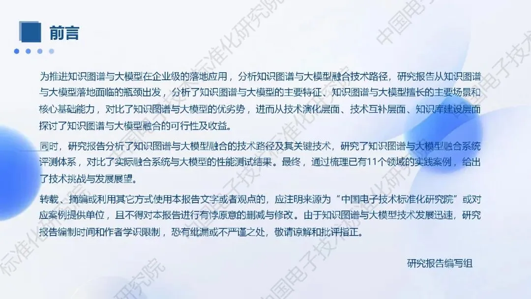 本报告旨在推进知识图谱与大模型在企业级应用中的落地,通过分析两者融合的技术路径,研究其可行性及收益。报告首先从知识图谱与大模型落地面临的瓶颈出发,详细探讨了知识图谱与大模型的主要特征、应用场景和核心基础能力,并对比了各自的优劣势。进而,报告从技术演化、技术互补和知识库建设三个层面探讨了知识图谱与大模型融合的可行性及收益。此外,报告还分析了知识图谱与大模型融合的技术路径及其关键技术,研究了融合系统的评测体系,并通过实际案例展示了融合系统在不同行业中的应用效果。最后,报告提出了技术挑战与发展展望。
