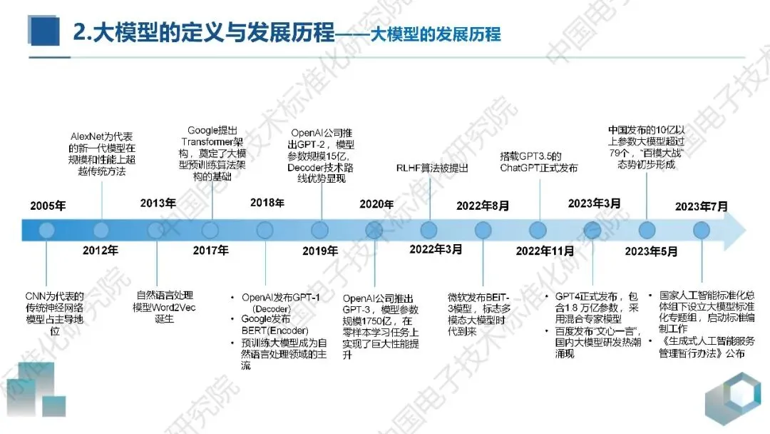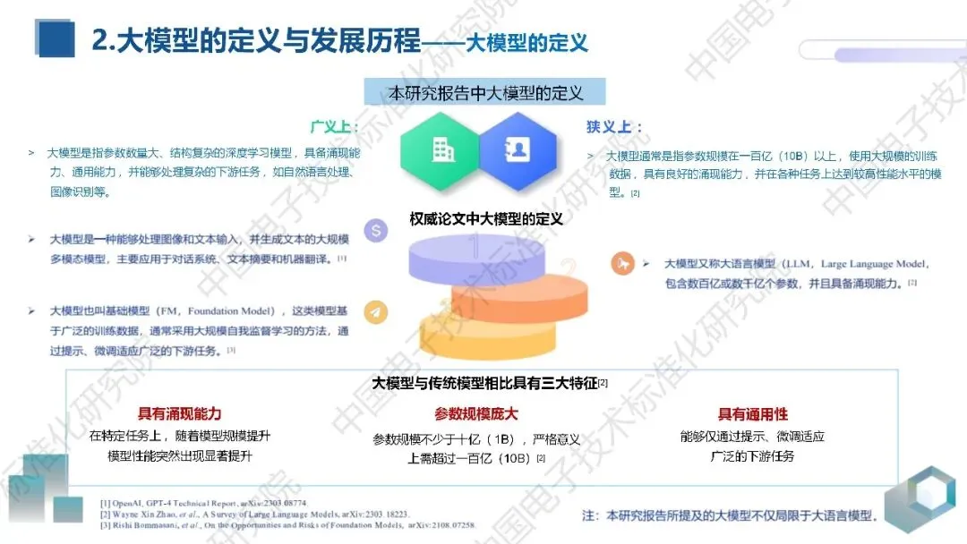 大模型通常指参数规模在一百亿(10B)以上的深度学习模型,具有良好的涌现能力和通用性,能够处理复杂的下游任务,如自然语言处理、图像识别等。大模型的发展始于预训练模型的兴起,如BERT和GPT系列,通过海量数据的训练,大模型在各种任务上达到了较高的性能水平。特别是GPT-3和GPT-4的推出,标志大模型进入了多模态和超大规模的新阶段。
