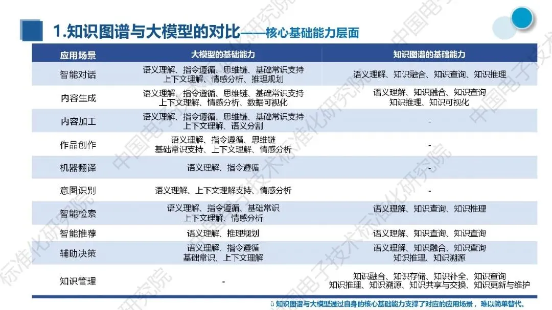 知识图谱的核心基础能力包括语义理解、知识融合、知识查询和知识推理,这些能力支撑了知识图谱在结构化知识表示和逻辑推理方面的优势。大模型则具备强大的语义理解、指令遵循、思维链和基础常识支持能力,能够通过海量数据的训练生成合理的响应和内容。然而,大模型在可解释性、可信赖性和领域服务能力方面存在不足。